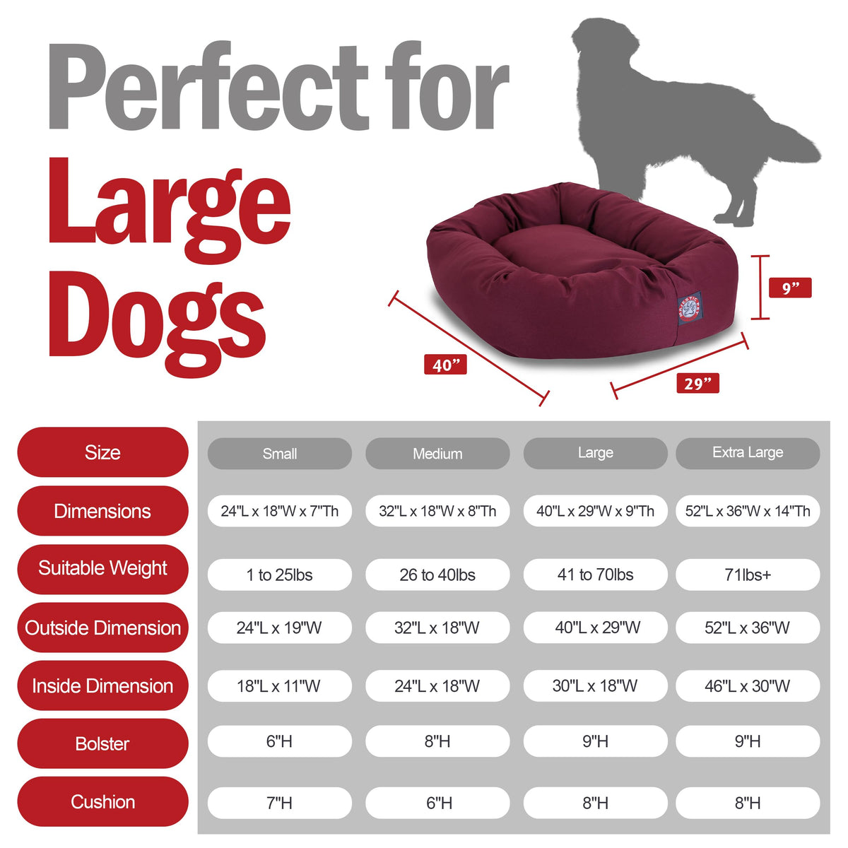 Q: What size dog is the Majestic Pet 40 Inch Bagel Calming Dog Bed suitable for?A: The Majestic Pet 40 Inch Bagel Calming Dog Bed is designed for larger dogs, providing ample space for them to stretch, play, and snooze comfortably. With dimensions of 40.0"L x 29.0"W x 9.0"Th, it is ideal for breeds such as Golden Retrievers, Labrador Retrievers, and other similar-sized pets.