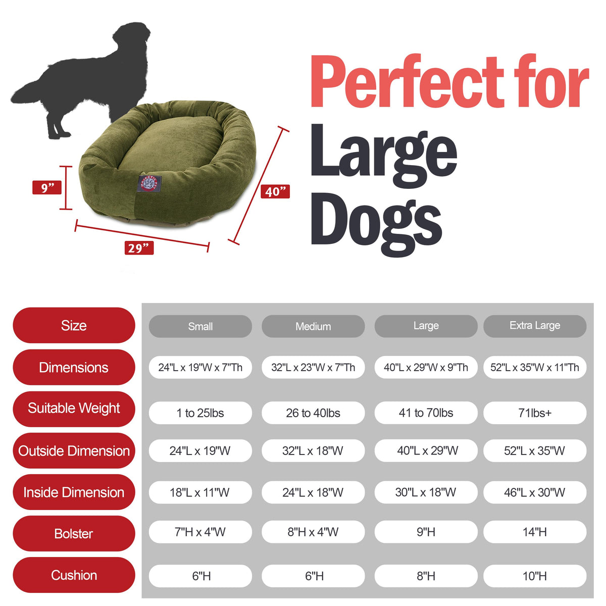 Q: What size is the Majestic Pet Dog Bed?A: The Majestic Pet Micro Velvet Calming Dog Bed measures 40 inches in length, 29 inches in width, and 9 inches in height, making it suitable for large dogs who enjoy curling up or stretching out.