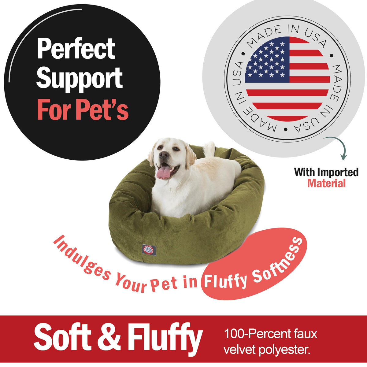 Q: What materials are used in the Majestic Pet Micro Velvet Calming Dog Bed?A: The Majestic Pet Micro Velvet Calming Dog Bed is crafted from plush, pet-friendly polyester, providing a soft and cozy space for your pet. Additionally, it features a waterproof 300/600 Denier base to protect your floors from accidents and spills.