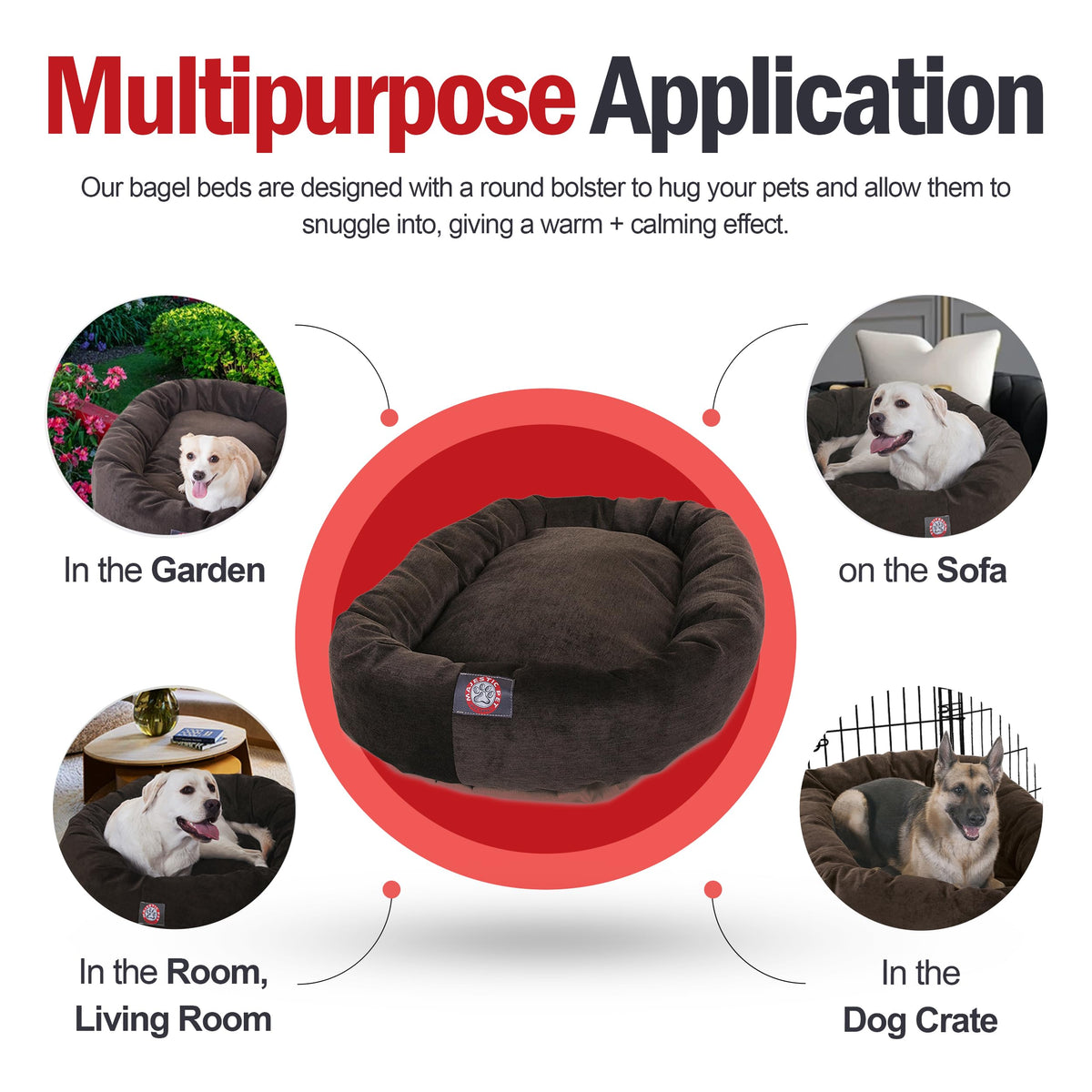 Treat your furry friend to the lap of luxury with our pet bed– the most comfortable, stylish, and practical haven for your beloved pet. Designed with a discerning pet owner in mind, our bagel dog bed is poised to redefine your dog's resting experience. This circular dog bed is crafted from plush, pet-friendly polyester and offers unrivaled coziness and long-lasting quality. Unlike ordinary pet beds, our fluffy dog bed is soft to the touch, providing a heavenly retreat for your furry companion. Watch your pet curl up in contentment or stretch out without a care. The base of our donut pet bed is fortified with a waterproof 300/600 Denier layer, a guardian against unwanted accidents and spills. Your floors stay pristine, and you enjoy peace of mind. The generous filling of premium High Loft Polyester Fil ensures maximum relaxation for your pet. This calming donut dog bed is designed for more than just comfort; it supports your pet's head, helping maintain a healthy spine. Machine washable with a water-resistant denier base, this round dog bed washable effortlessly combines sophistication and durability. The mattress has the perfect balance of form and function. Whether your pet desires a cozy corner for naps, a plush hideaway for relaxation, or a charming home decor addition, this round fluffy dog bed offers it all. The bagel bed is more than a bed; it's an exquisite piece of furniture that ensures your furry friend's well-being while elevating your living space. Indulge your pet in the epitome of comfort. Order your Micro Velvet Bagel Dog Bed today. Take the chance to create a world of contentment and luxury for your furry friend while adding a touch of sophistication to your home.