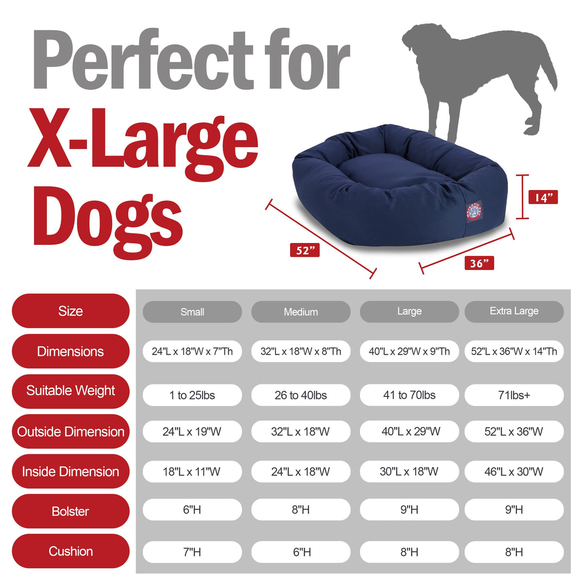 Q: What are the dimensions of the Majestic Pet 52 Inch Bagel Calming Dog Bed?A: The Majestic Pet 52 Inch Bagel Calming Dog Bed measures 52.0 inches in length, 35.0 inches in width, and 14.0 inches in thickness, making it suitable for larger dog breeds.