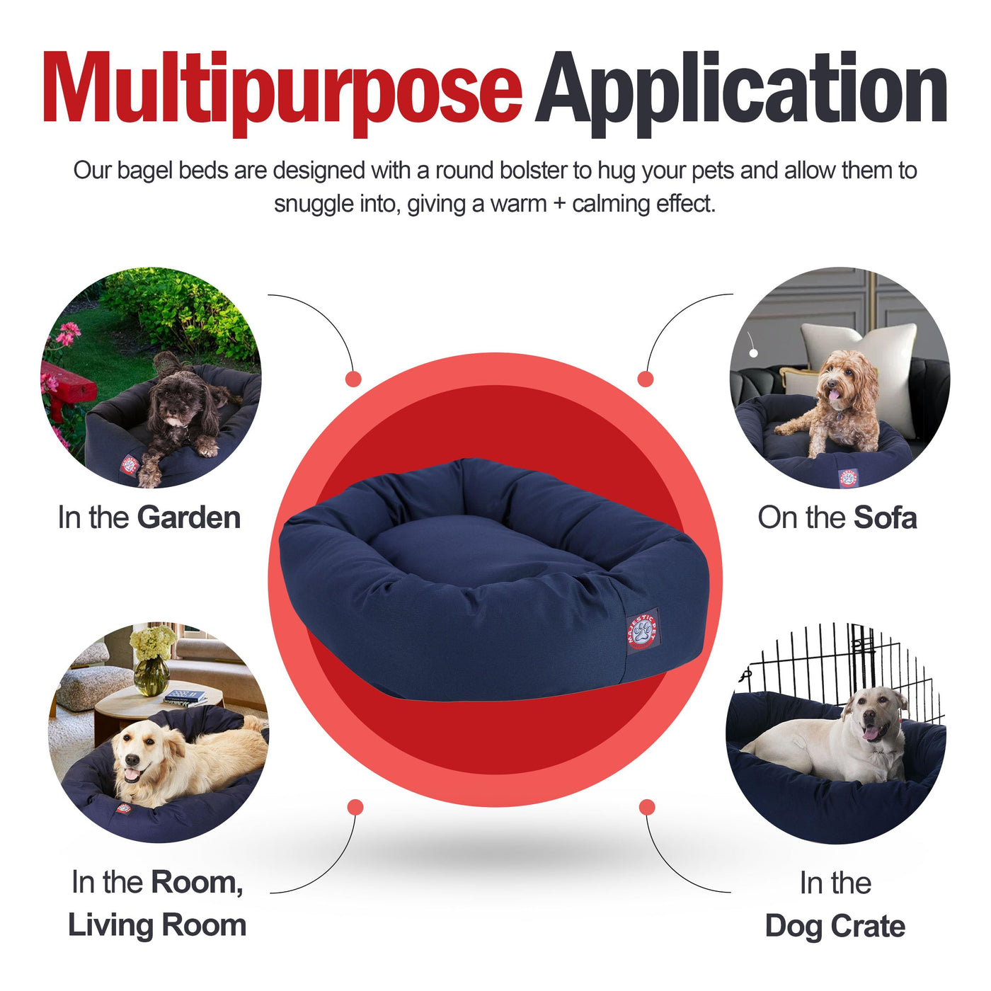 Introducing the pinnacle of pet comfort – Your majestic pet dog bed!Luxurious comfort for your furry royalty: You cherish your beloved pet like family, and they deserve nothing but the best. Crafted to provide a haven of comfort and security, this circular dog bed is more than a pet accessory; it's an invitation to a world of snuggles, contentment, and relaxation.Crafted for optimal well-being: Your pet's health and happiness are paramount. Our calming donut dog bed is thoughtfully designed with a bolster to cradle your pet's head and provide essential neck and spine support: no more sleepless nights, just dreams of joy and well-being.Style meets functionality: Our round dog bed washable effortlessly complements any room's décor, making it a chic statement piece for pet owners with a discerning eye. Yet, this isn't just about looks; it's about durability. With a base made from waterproof 300/600 Denier, it's a fortress against life's little messes. Stress-free living at its finest!For our larger companions: We understand that pets come in all shapes and sizes. Our dog bagel bed is tailored for your dogs, providing the perfect canvas for your four-legged friend to stretch, play, and snooze. The ample space ensures they have room to be their wonderful, spirited selves.Machine-washable heaven: You and your pet's journey through life can sometimes be spotless, and their bed is different. Our round fluffy dog bed is a breeze to clean – throw it in the washing machine and tumble dry it on low heat. With this bed, maintaining a fresh and clean sleeping space for your pet is effortless.Add this bagel bed to your cart now and indulge in a world of luxury, health, style, and practicality. Your pet will thank you with wagging tails and endless love. Make the change today because your pet deserves the finest.Order now and gift your pet a piece of paradise!