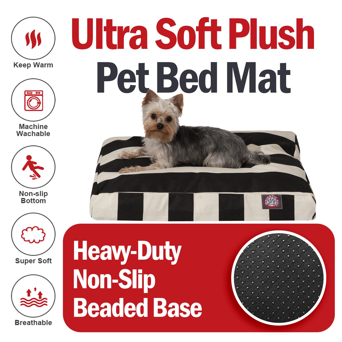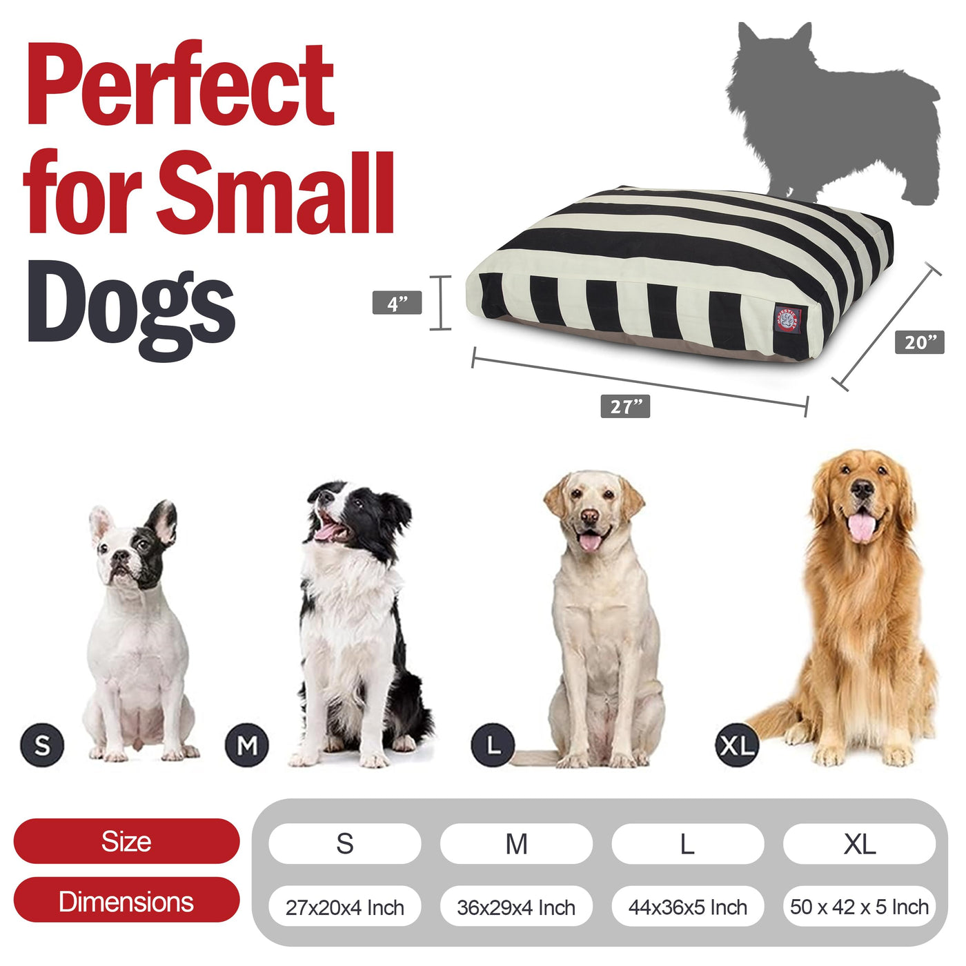 Q: What are the dimensions of the Majestic Pet Rectangle Small Dog Bed?A: The Majestic Pet Rectangle Small Dog Bed measures 27 inches in length, 20 inches in width, and 4 inches in thickness, making it an ideal size for small dog breeds.