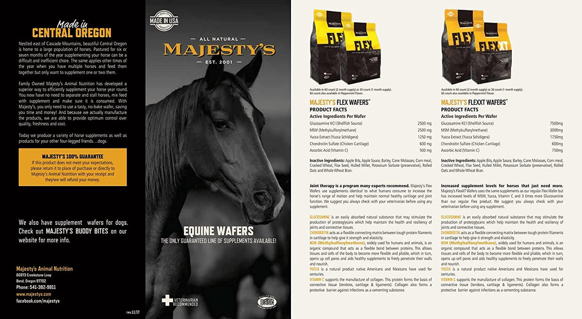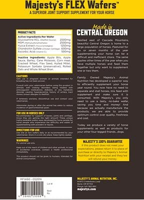 Contains one (1) bag of Majestys Flex Wafers Superior Performance Horse/Equine Joint Support Supplement. Flex Wafers combined five superior support supplements to produce an easy-to-use supplement that increases range of motion and reduces inflammation | NO WASTE - Horses often will ignore top dressed feed with powders or liquid, our unique wafers solve this problem by directly delivering the optimal amount of supplements. | UNIQUE - Made of molasses, oats, and apple sauce which are combined to make sure everything in the wafer remains in the wafer, we achieve around 98% feedability. | TWO MONTH SUPPLY - Each bag contains 60 wafers. As per directions, one bag of Majastys Flex Wafers will provide your horse with the care and nutrients they deserve for two months. | MADE IN THE USA - Our wafers are produced by ourselves in beautiful Central Oregon, east of the Cascade Mountains. We take pride in producing these wafers ourselves and put quality at the forefront of everything we do.