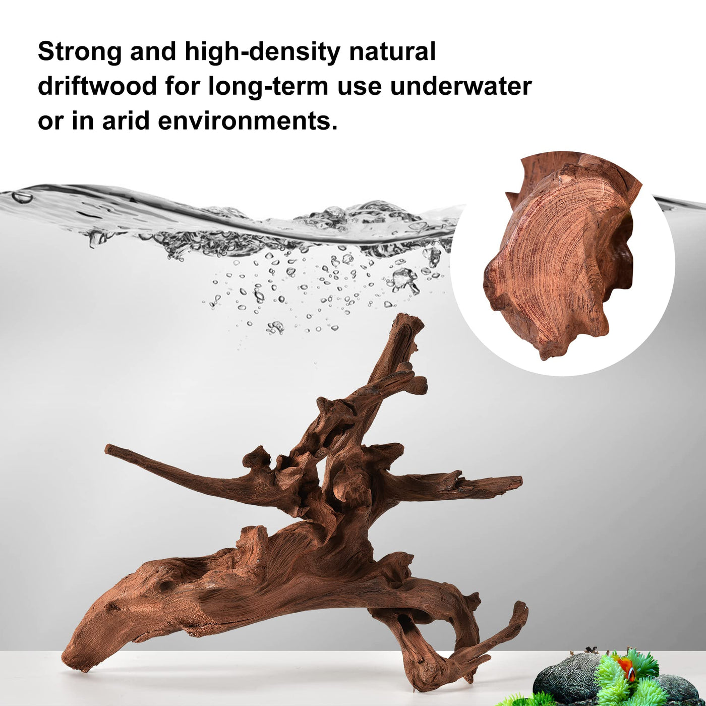 Q: How do I care for the driftwood once it's in my aquarium?A: To care for your driftwood, ensure it is properly submerged in water. Regularly check for any debris or algae buildup, and rinse it gently if needed. It’s designed to last a long time in both underwater and dry environments.