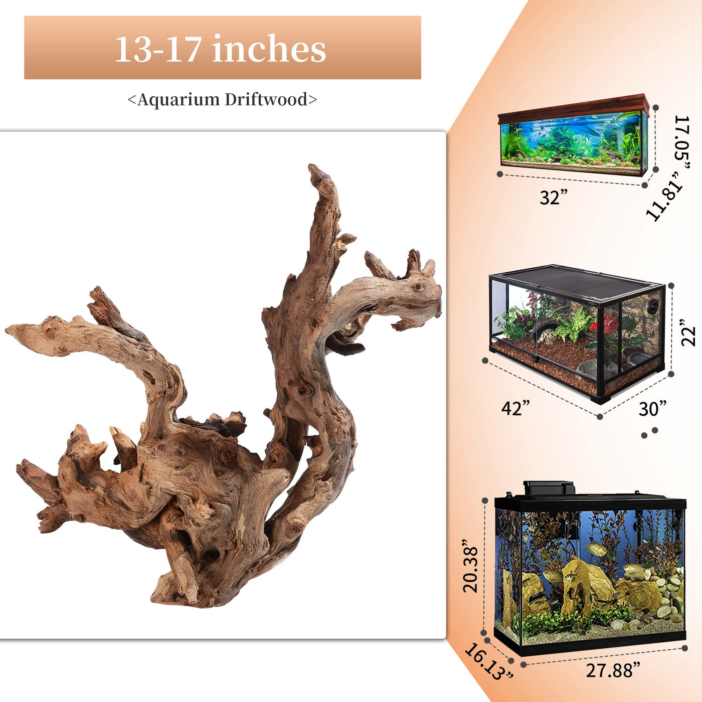 High-Quality Driftwood, Sturdy And Durable, Can Be Used For A Long Time Under Water Or In Drought Environment.&Nbsp; It Is Perfect Decoration As Well As An&Nbsp; Ideal Choice For Reptile To Climb On, Adding Natural Beauty To Your Aquariums Or Terrariums. The Pictures Shown Are Only Some Of The Driftwoods, What Your Get May Be Different From Pictures Show. Package Included:1Pcs Driftwood (Sizes Varies From 13 To 17 Inches,Each Driftwood Is Over 1.3 Lbs ) Helps Balance Water Ph Levels, Stabilizes Environments.