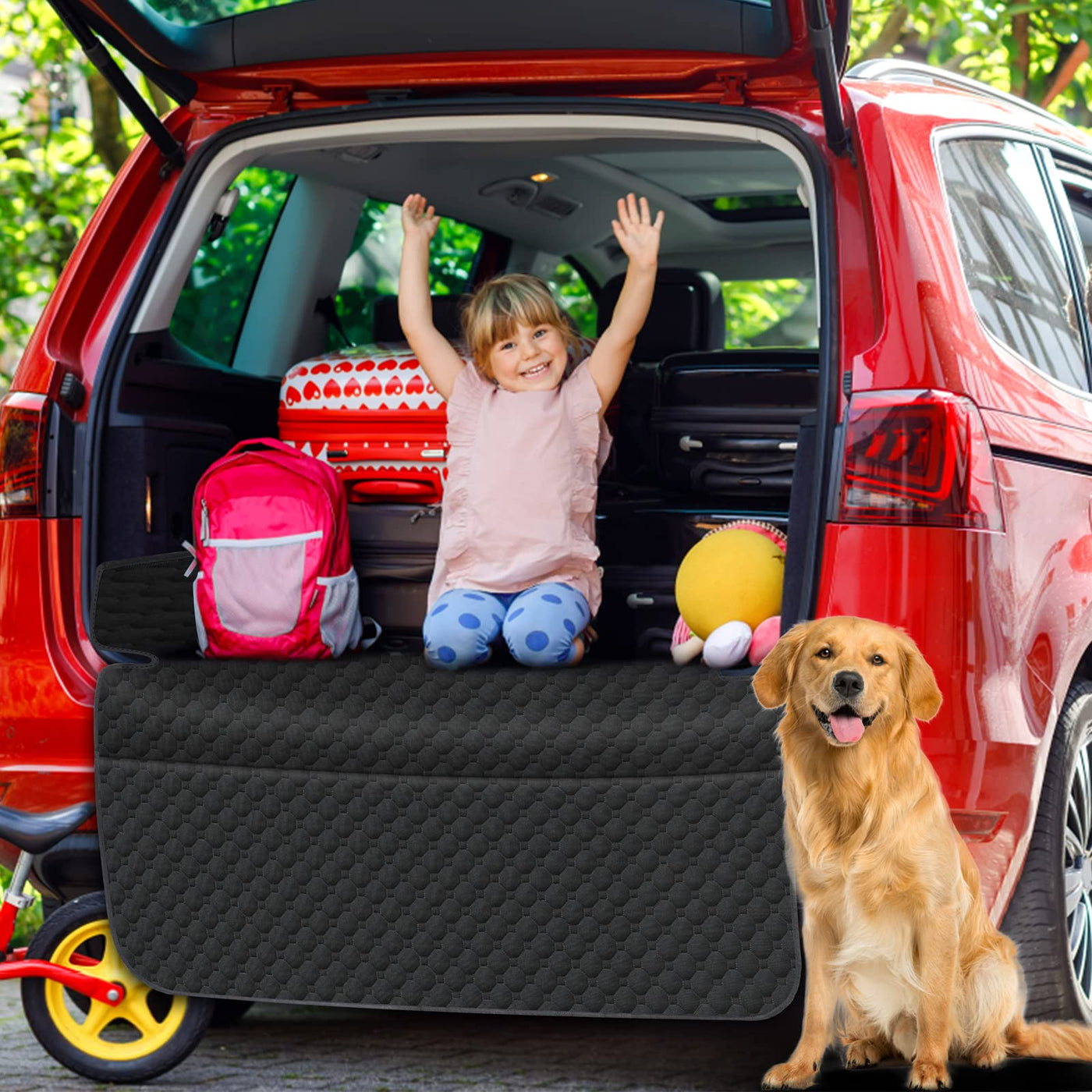 SUV Cargo Liner for Dogs Waterproof Dog Seat Cover for SUV can be the Finest Gifts To Pet Lover Features: Made of heavy duty polyester for durability; Three reinforced Water Resistant layers for Extra Comfort; Quilted pattern for high-end customer experience; Protects BackSeats From Dirt, Spills, Scratches, Hair, Fur, And Other Messes Size: Approximately(inculded Bumper Flap): 54W*84L inches, Weight: 3.78 pounds; Perfect for most cars, secures over seat using two headrest loops, two seat , helping pet dogs stay in place cozily Material: Premium 600D Polyester Fabric makes the Cargo Cover waterproof, PP cotton provides a comfortable ride for your pet, 210D Polyester cloth further enhances the waterproof performance Protection: The special Bumper Flap are easy for your dog to get in or out of car and protect your car Bumper from scratching and hair; Slit Design can be Perfect match for leveling the corner Design: Including two large pockets; 2 Seat; Pet cargo cover can also be used as a cargo protector when conveying goods and an outdoor picnic mat Installation: Adjustable snaps buckles for easy installation by just attaching them to headrest Clean: Very Easy to Clean; Wiped clean with damp cloth or hose flush Package Included: 1 * SUV Cargo Liner for Dogs