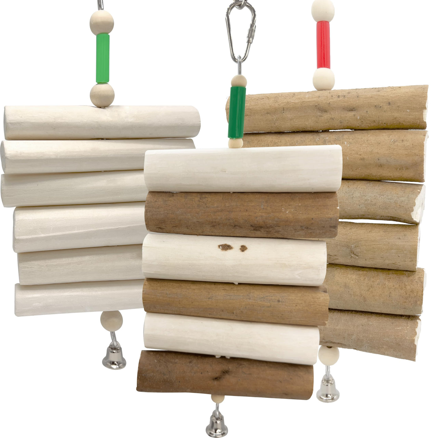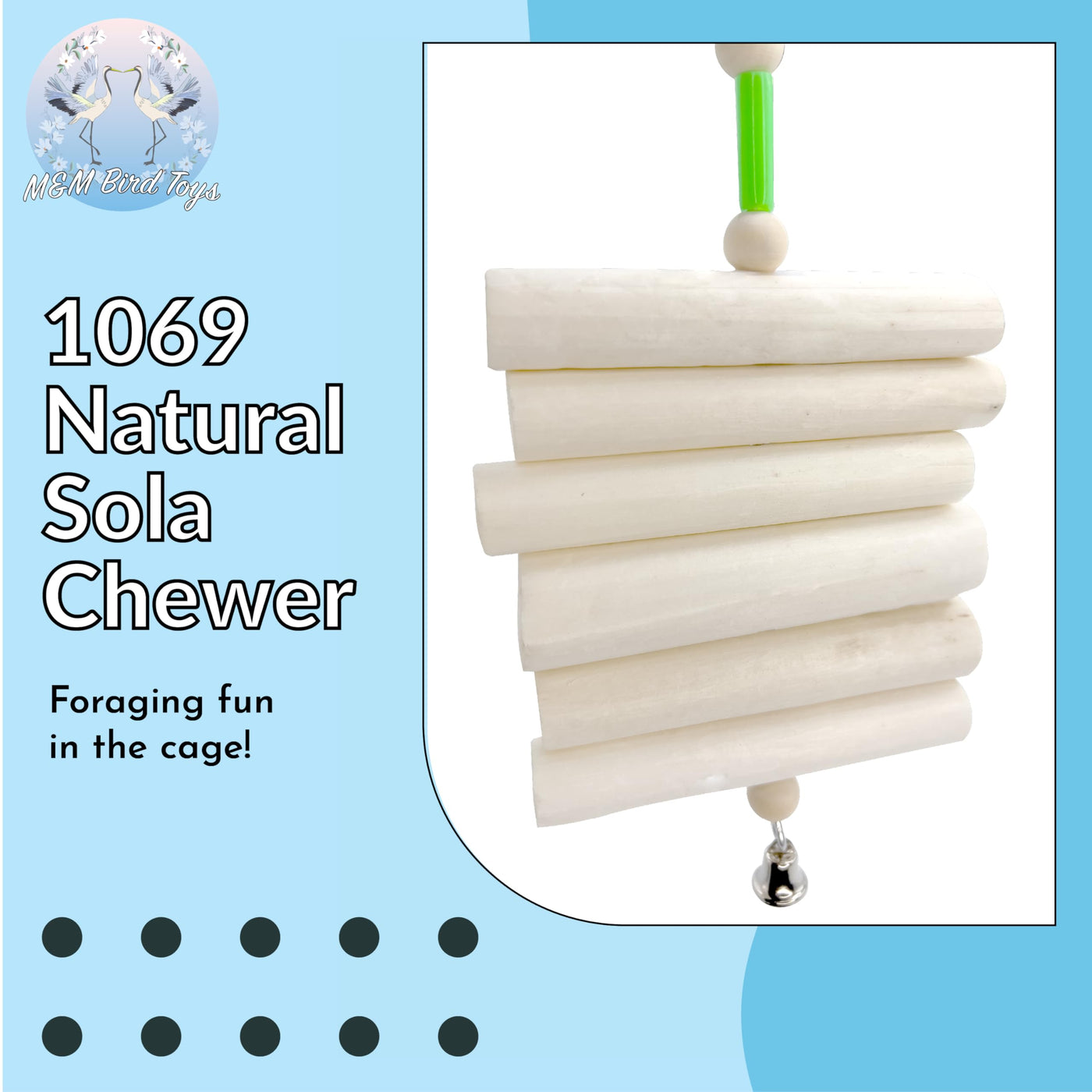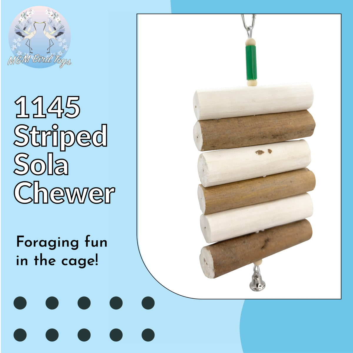 The **1146 Pack Of 3 Sola Chewers** From M&M Bird Toys Offers A Fantastic Trio Of Chewable And Shreddable Fun For Pet Birds Of All Sizes. Each Toy Is Made From Stacked, Natural Sola Logs, Known For Their Soft, Pithy Texture That Birds Find Irresistible To Chew. The Lightweight Nature Of Sola Wood Makes It Easy For Birds To Manipulate, Shred, And Gnaw, Promoting Healthy Foraging Instincts And Beak Conditioning. Each Toy Is Suspended By A Sturdy Quick Link Connector With Colorful Accents-Either Green Or Red Beads-That Add A Splash Of Color To Your Birds Cage. The Toys Also Include A Small Bell At The Bottom, Adding An Auditory Element That Enhances Engagement And Excitement For Your Feathered Friend. Birds Will Enjoy The Texture, Sound, And Visual Appeal, Making These Toys A Multi-Sensory Treat. Handcrafted In Florida, This Set Of Sola Chewers Can Be Hung Individually Or Placed Together For Added Variety. The Versatile Design Allows For Customization-Pet Owners Can Attach Additional Foraging Materials Or Treats To Increase The Fun. These Toys Provide A Safe And Engaging Way For Birds To Exercise Their Natural Instincts In A Cage-Friendly Setup. - Height When Hanging: 9 Inches (22.8 Cm) - Width: 3.5 Inches (8.9 Cm) - Weight: Under 1 Ounce Per Toy - Materials: Natural Sola Wood, Bird-Safe Beads, Quick Link Connectors, And Small Bells - Handcrafted By Mai In Our Small Florida Shop