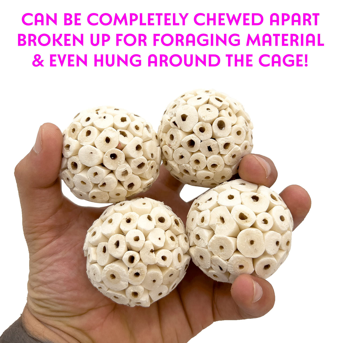 Q: Are the Sola Bird Balls safe for my pet bird?A: Yes, the Sola Bird Balls are made from natural, air-dried sola wood, which is bird-safe and free from harmful chemicals, ensuring a safe chewing experience for your pet.