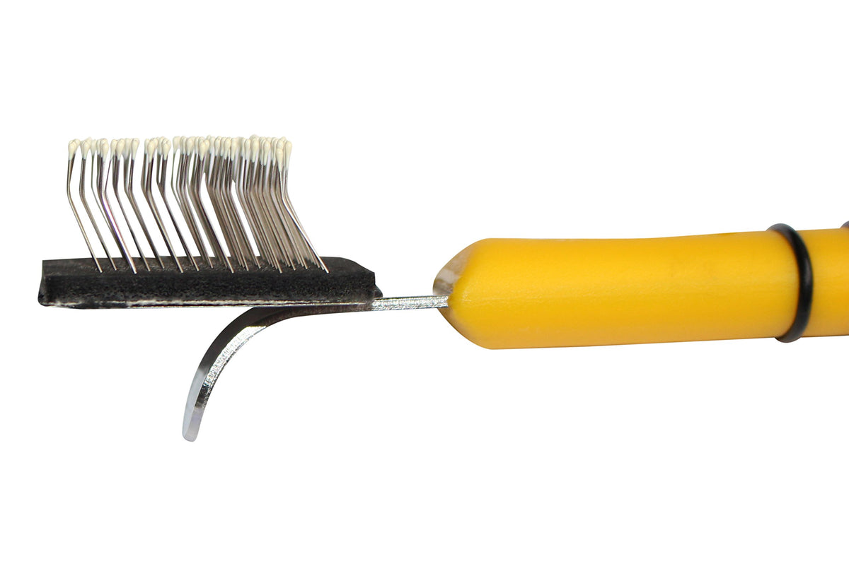 This special brush is excellently designed for removing local tangling. It consists of pressed high-grade bristles which are attached on a flexible bristle-receptacle, a fibre-enhanced plastic handle with non-slip rubber bands and a finger hook with a limiting function. In contrast to normal brushes, we have here a opposing working principle. The bristles open when used, thus spring-steel bristle receptacles adjusts itself in order to bend the finger hook, when you discontinue the brush, the spring steel gets back to its original straight form and thereby securely holds the combed hair still.