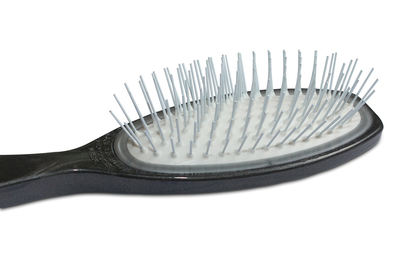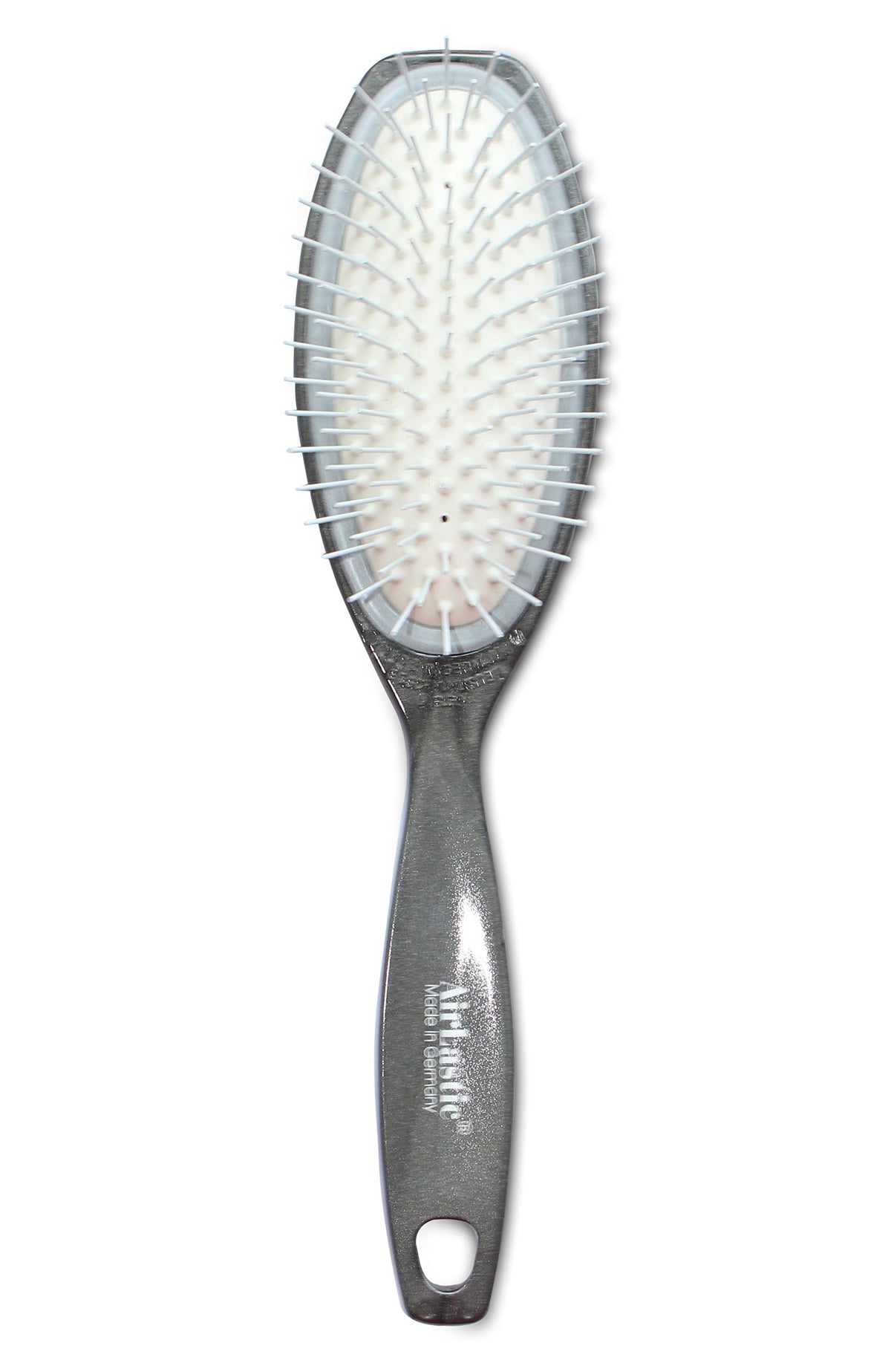 DescriptionPlastic brush big 215 x 75mm AIRLASTIC-rubber insert - no return of pins! Body gray green red or blue metallic color respectively pads with ultrasound mounted/welded Pins stove-enameled and thus free from nickel.