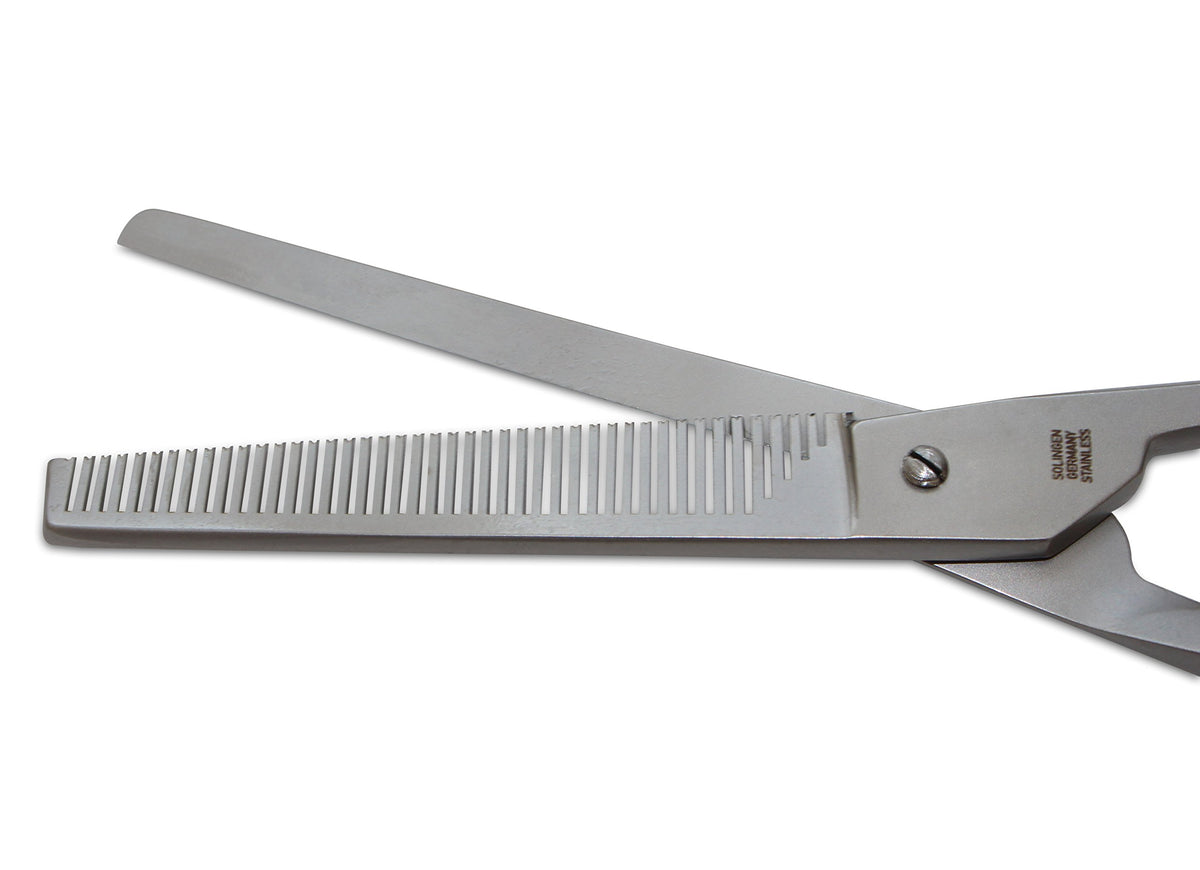 These thinning scissors are toothed on one side. It consists of rust-free, hardened high-grade steel. The smooth cutting edge is polished, the teeth have precision prisms on its upper side, which has been ground after tempering, these hold the hair-to-be-cut securely. A changeable, bolted, finger hook is included. These scissors are from our professional products line and is excellently suited for working on transition parts or on the head. The length of the scissors reaches 17 cm, the number of the teeth is 46.