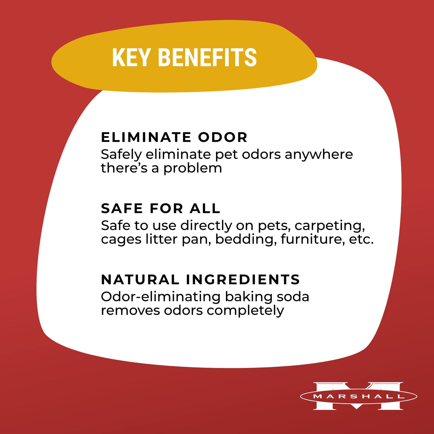 Q: How does the Marshall Pet Products Odor Remover work to eliminate severe odors?A: The Marshall Pet Products Premium Natural Enzymatic Odor Remover contains a powerful formula that penetrates deeply to eliminate embedded odors. It uses baking soda and enzymes to safely and effectively neutralize strong smells, making it particularly effective for small animals and ferrets.