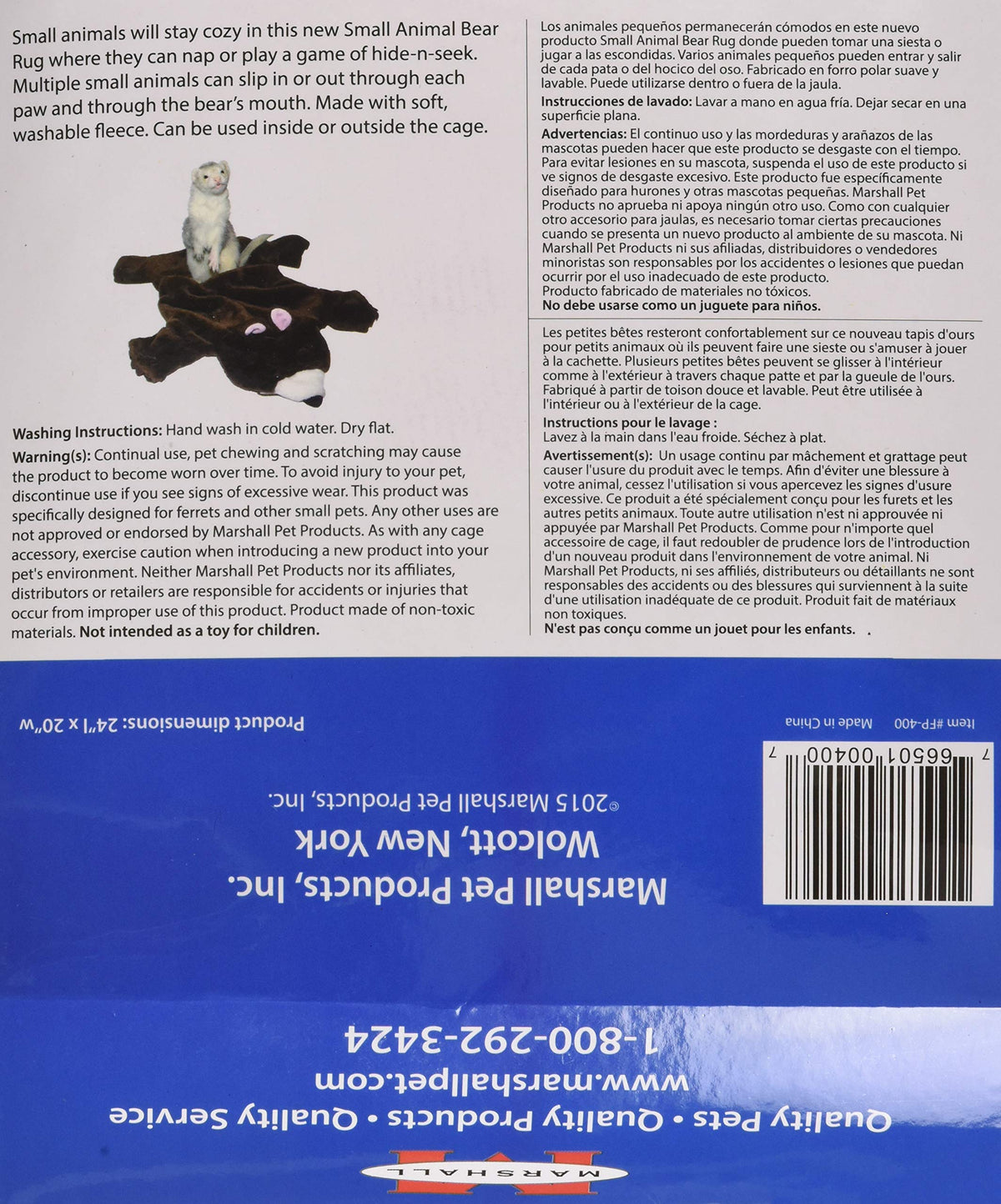 Q: What sizes of small animals can use the Marshall Small Animal Bear Rug?A: The Marshall Small Animal Bear Rug is designed to accommodate various small pets, including ferrets, rabbits, and guinea pigs. With dimensions of 24 inches long by 20 inches wide, it's spacious enough for multiple small animals to enjoy.
