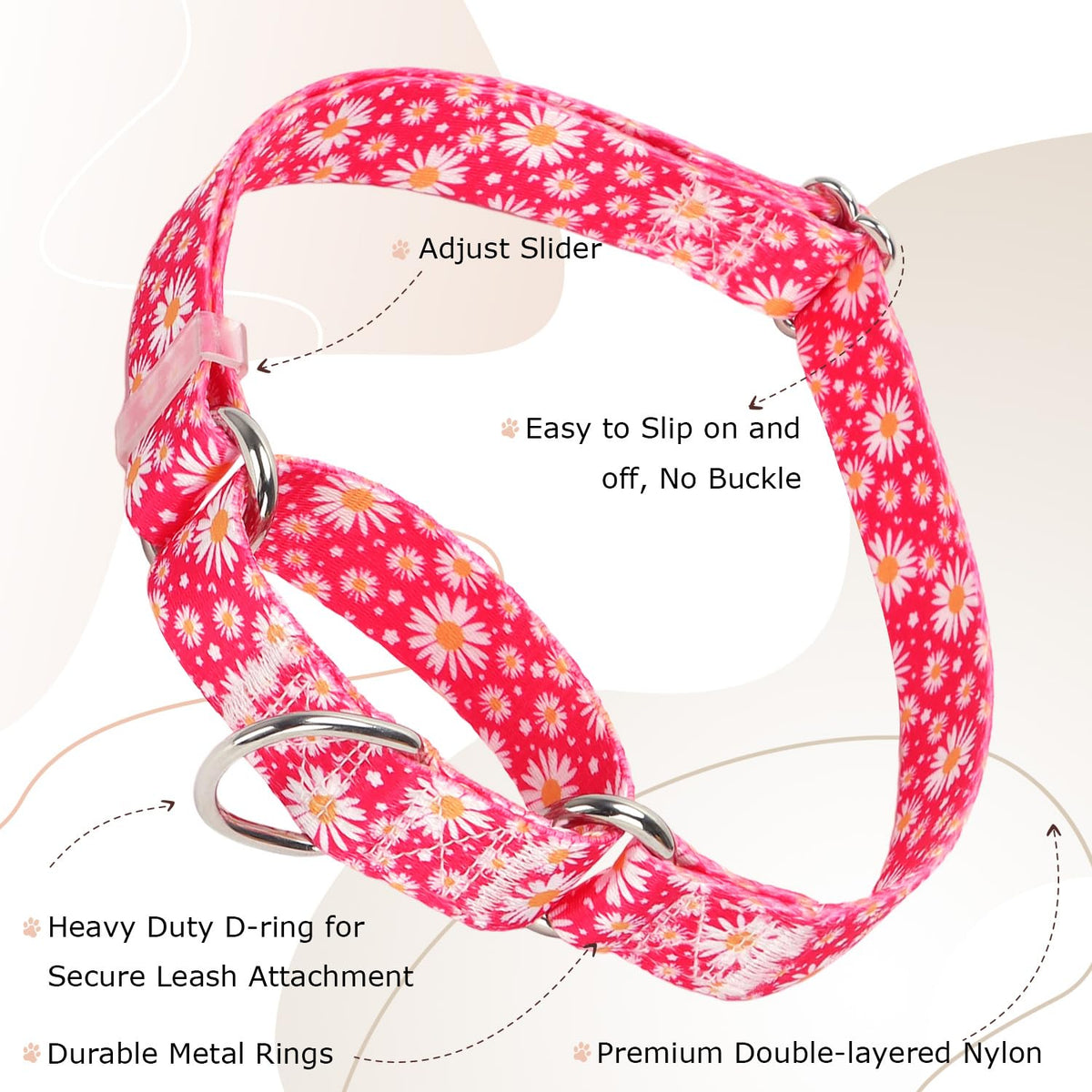 Martingale Dog Collar With Training Control Feature, Martingale Collar Is A Better Alternative To Standard Collar. The Dog Collars Are Made Of High-Density Nylon Webbing, Heavy Duty Hardware. Strict Pulling Test Conducted Before Production. Soft Webbing, Durable, Wear-Resisting And Hypoallergenic, This Dog Collar Would Not Hurt To Dog'S Skin. Metal D-Ring, Strong And Available For All Types Of Dog Leashes. Romantic Pink Color, Lovely Daisy Flowers, Make Your Dog More Charming.