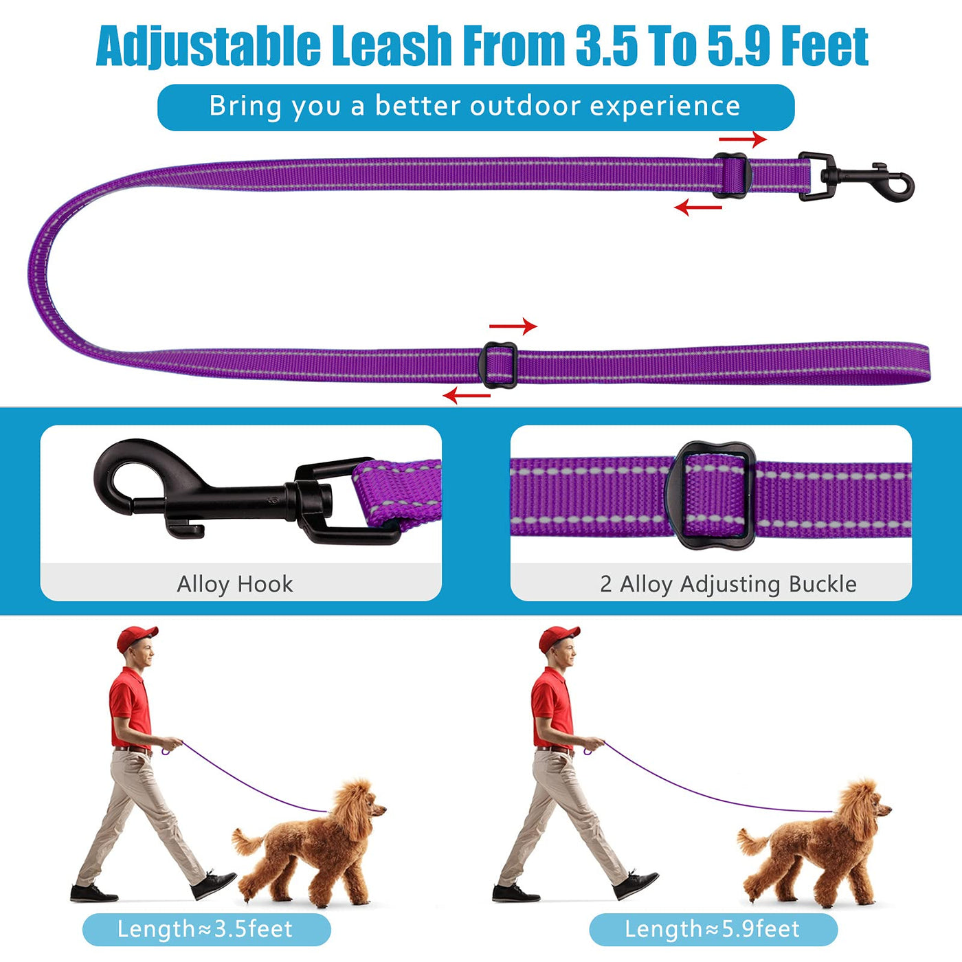 Q: How do I adjust the length of the leash?A: The leash can be adjusted easily from 3.5 feet to 5.9 feet in length, allowing you to find the perfect balance between control and comfort for you and your dog.