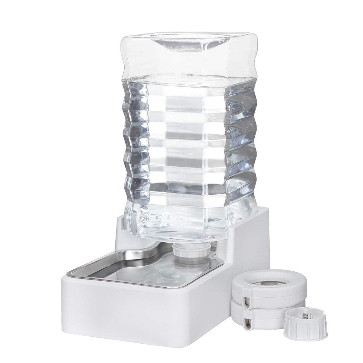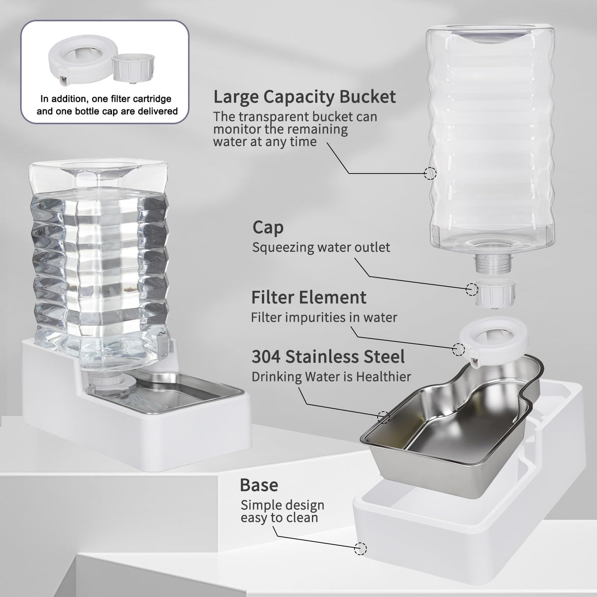 [9L Large Capacity] 9L water storage capacity is perfect for medium and large dogs.This pet waterer utilizes gravity to automatically refill water. This allows your pet to enjoy fresh, clean water at all times.The 9L capacity ensures a daily supply of water for kittens and is recommended for busy pet owners. | [Excellent Material] The automatic pet waterer is made of healthy and environmentally friendly PP material, no odor, durable, pets can use it safely for a long time. The drinking bowl is made of high quality 304 stainless steel, durable, not easy to deform, no rust, clean and hygienic, transparent container design can help you know when you need to add water. | [Triple Filtration]The cartridge is made of high-density nano-grade microporous filter cotton material, which can isolate impurity particles, remove residues and block other harmful substances from entering, and activated carbon can further recycle the water source, deeply soften the water, improve the taste and retain the pure minerals in the water, thus achieving a full purification of the living water source and avoiding various safety hazards brought about by water problems. | [Easy to Use] Automatic pet watering system with gravity fed design that replenishes your pet s water supply when it reaches low water level. The upgraded feeder adds two filters and two lids that can be used as replacements. The lid with the longer spring can be used without the filters and the lid with the shorter spring can be used with the filters. | [Easy to Clean ] Split design makes every part of this automatic water dispenser very easy to disassemble and clean. It is suitable for both indoor and outdoor.