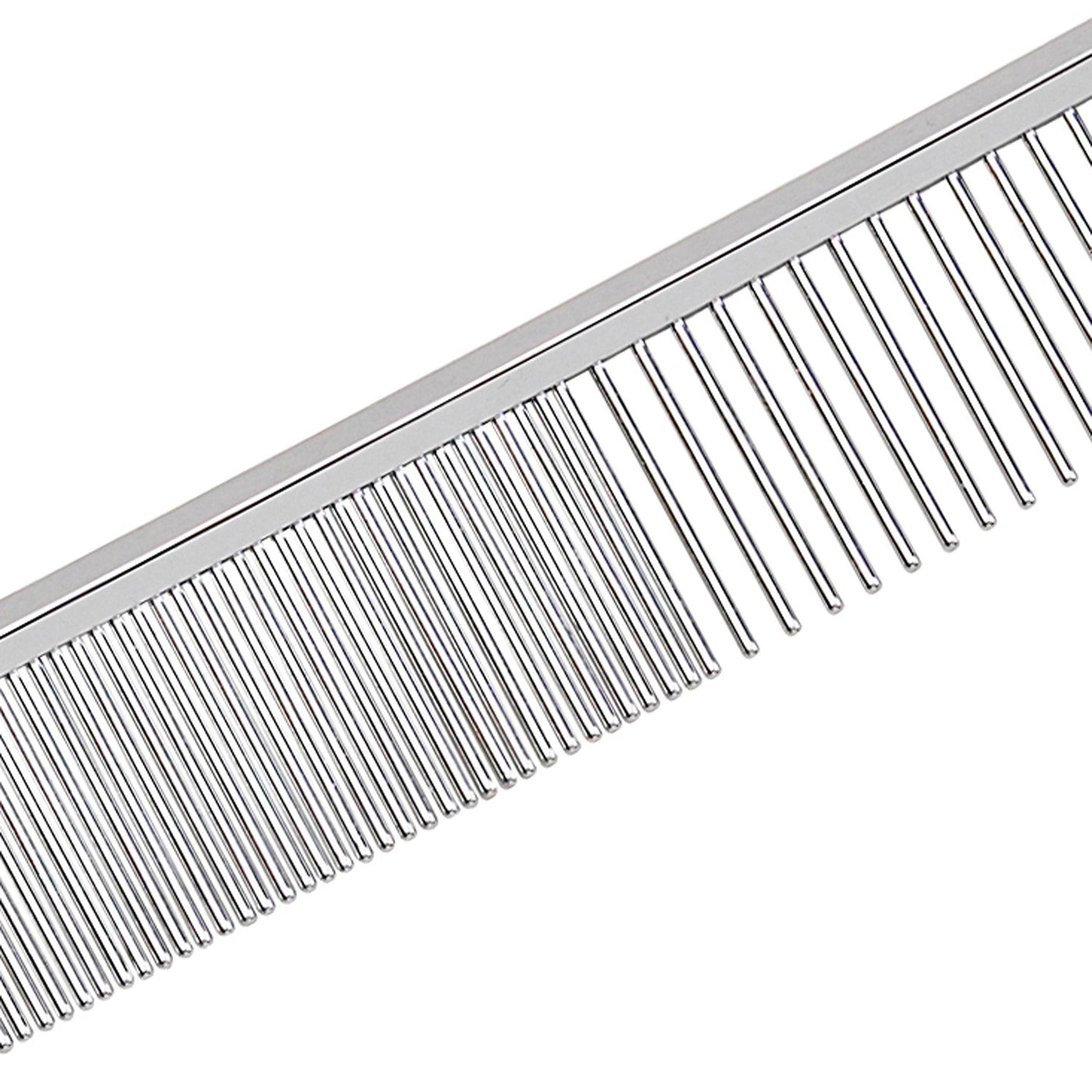 Master Grooming Tools Grooming Combs were designed by groomers specifically to increase comfort and reduce the risk of injury. Versatile combs are an essential tool for fluffing, detangling, and removing dead hair from medium to longhaired dogs and cats.Hardened steel teeth are drilled into the solid brass steel-plated spineNon-slip spine is contoured for a better grip and ease of useMaterial: Hardened steel teeth drilled into solid brass steel-plated spine