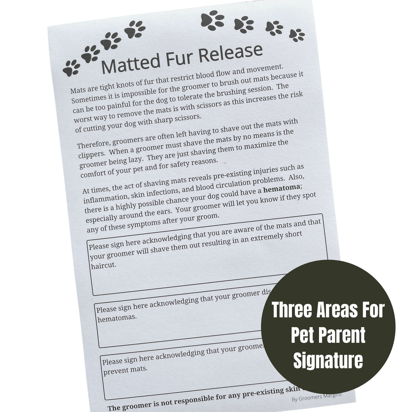 Q: How do matted fur release forms help in communicating with pet parents?A: These forms provide clear and concise information about why certain grooming procedures are necessary when dealing with matted fur. They include multiple sections for pet parents to acknowledge their understanding of the grooming process, which helps to establish transparent communication and reduces misunderstandings regarding the grooming results.