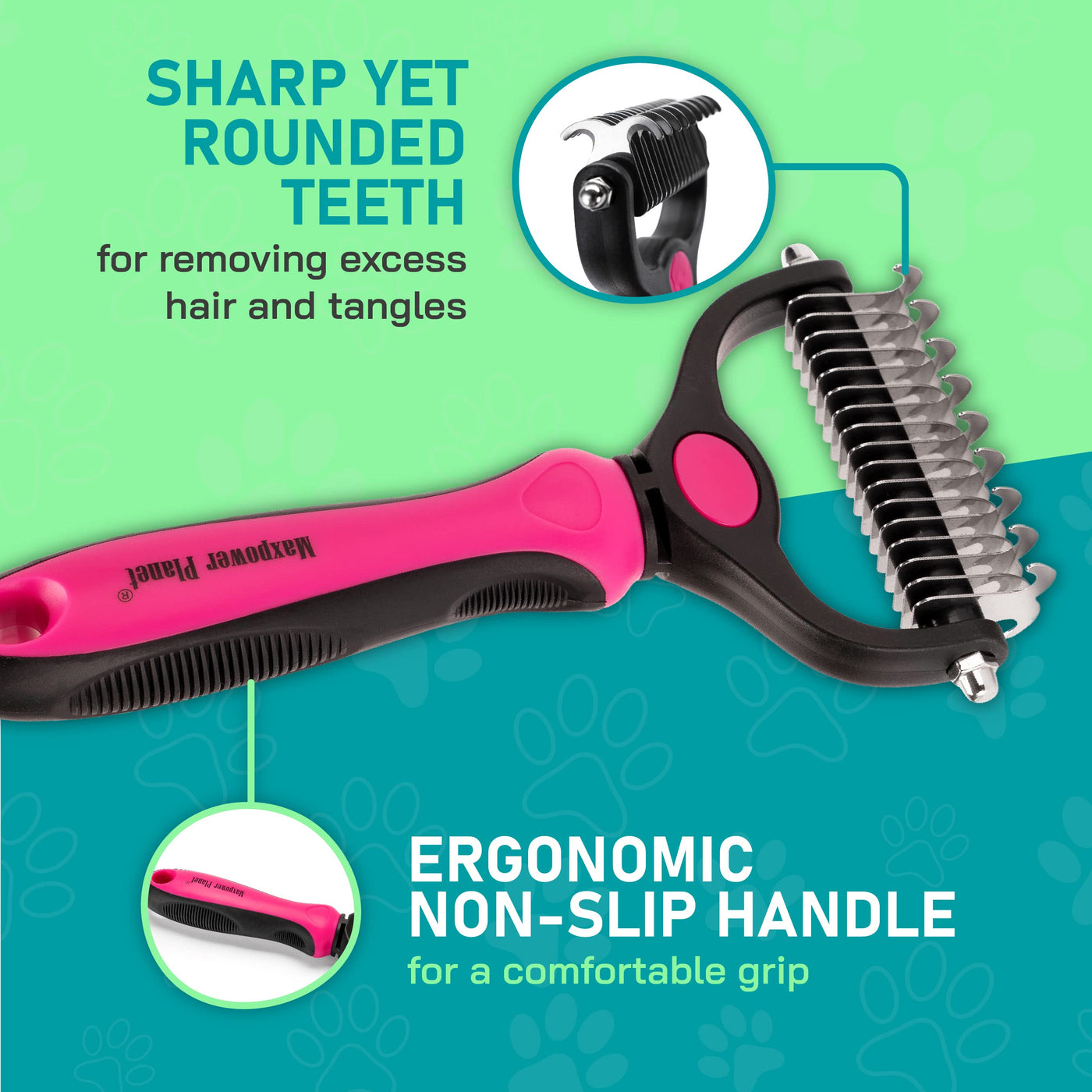 - Q: What makes the Maxpower Planet Pet Grooming Brush effective for shedding? A: The Maxpower Planet Pet Grooming Brush features a dual-sided design with a 9-teeth side for tackling stubborn mats and tangles, and a 17-teeth side for thinning out and deshedding your pet's fur. This combination allows for effective grooming, reducing shedding by up to 95%.