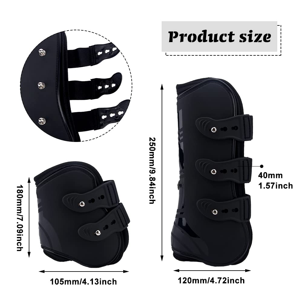 Feature:- Horse leg boots, PU shell, diving inner material.- Multiple adjustment buckles for more precise adjustment of boots.- The horse leg boots protect the horses leg from injury or reduces the damage when the horse jumps over the obstacle.- Open front allows to move freely on high-speed activities like jumping and running.- Elastic strap with quick loopback closures is adjustable and secured in place.- Easy to clean and maintain.Specification:Material: PU + NeopreneColor: Black/Brown/Red/BlueSize: M/LElastic band length:M: About 40mmL: About 55mmTotal length: About 250mmPackage includes:2 pcs x Front leg boots2 pcs x Hind leg boots