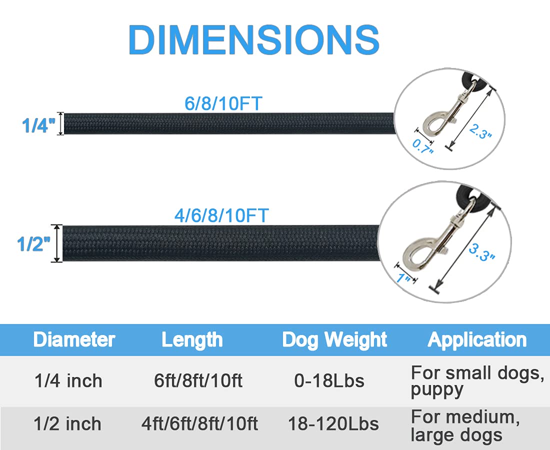 About Maypaw 4 Ft/6 Ft/8 Ft/10 Ft Dog Leash, Classic Solid Colors, Strong Nylon Rope Dog Leash Reinforced With Leather Tailor Connection Heavy Duty Silver Clasp Why Choose This Leash? Whether You'Re Navigating City Crowds Or Hiking Rugged Trails, This Leash Total Adapts To Your Lifestyle In 4 Different Length. Crafted With Military-Grade Nylon And Leather-Reinforced Stitching, It Combines Strength With Style. The 360 Rotating Clasp Ensures Hassle-Free Walks, While Vibrant Colors Keep Your Pup Visible And Fashionable. Detailed Description Size Guide: Small Dogs (Under 18 Lbs): 1/4'' Thin Rope + Lightweight Clasp For Delicate Necks. Medium/Large Dogs (18-120 Lbs): 1/2'' Thick Rope + Reinforced Clasp For Maximum Security. 4 Foot: Suitable For Busy Streets And Urban Walks - Keep Your Dog Safely Close. 6 Foot: All-Purpose Leash For Daily Walks, Playdates, And Training Sessions. 8 Foot: Explore Parks And Trails While Letting Your Dog Sniff Freely Yet Safely. 10 Foot: Ultimate Freedom For Hiking, Beaches, Or Open Spaces. Color Pairing Tips: Black/Blue: Timeless For Everyday Use. (Such Daily Walking, Professional Grooming Visits) Pink/Green: Add A Playful Touch To Neighborhood Strolls. Orange/Yellow/Red: Stand Out During Holidays, Camping, Or Evening Walks. Comfort & Control: 360 Rotating Clasp: Easy Attachment To The Collar Or Harness, Prevents Tangling And Allows Natural Movement. Round Rope Handle: Soft In Handle, Easy To Hold And Control Your Dogs. Q: Can It Handle A 100Lb Dog Pulling? A: Yes! Our 1/2'' Rope Is Designed To Withstand Dogs Up To 120Lbs. Q: Is The Clasp Rust-Proof? A: Yes! The Heavy-Duty Metal Clasp Is Zinc-Alloy Coated For Long-Lasting Use In All Weather.