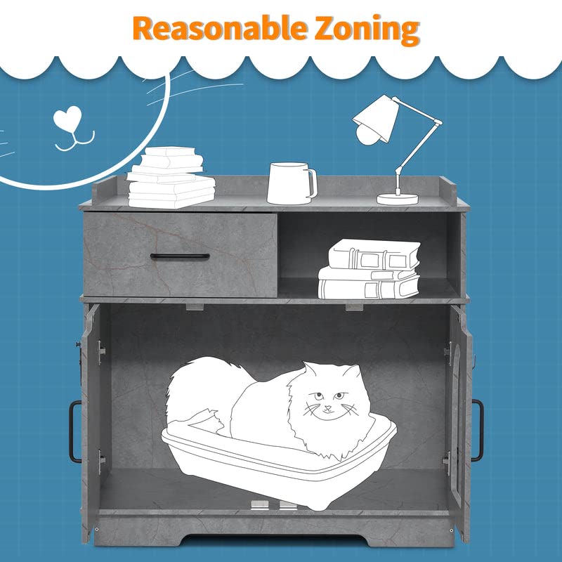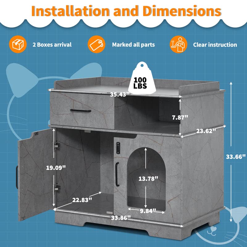 MCombo create a multi-function cat washroom storage bench for your lovely family. Our large litter box enclosure furniture house allows your cat to find a sense of belonging in a secure environment. The cat room furniture comes with extra drawer and storage help save space and keep things tidy. FOR YOU, FOR PETS! Buyer Reading Require assembly Package quantity: 2 Please carefully check the dimension before purchase. Item Specifications Item name: Cat Litter Box Furniture Hidden Type: 6012-CT46 Material: Particle Board Overall Dimension: 35.43 x23.62 x33.66