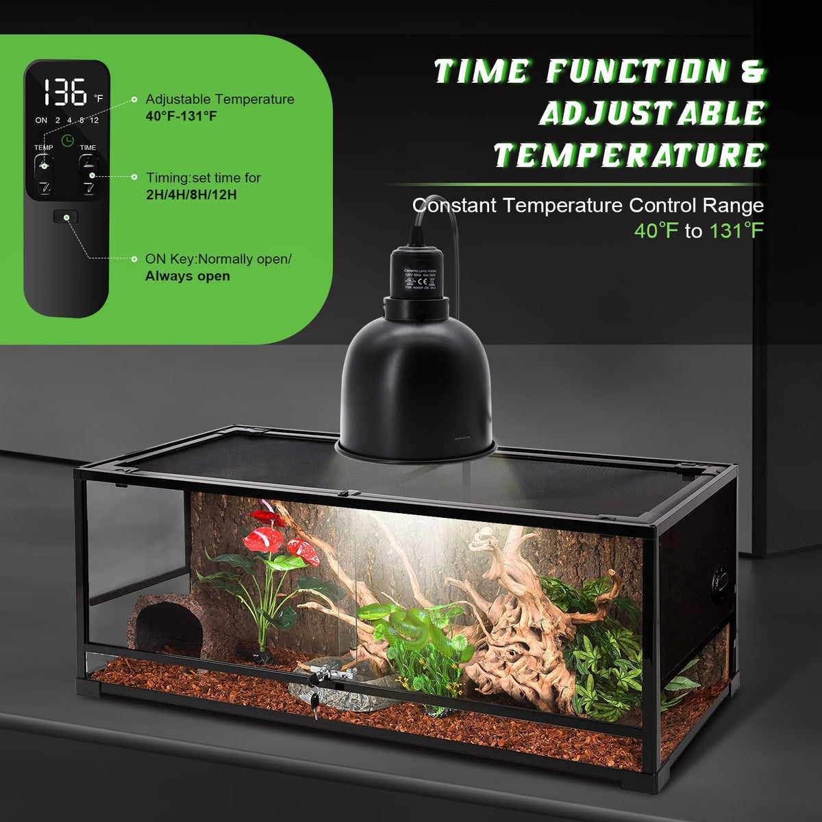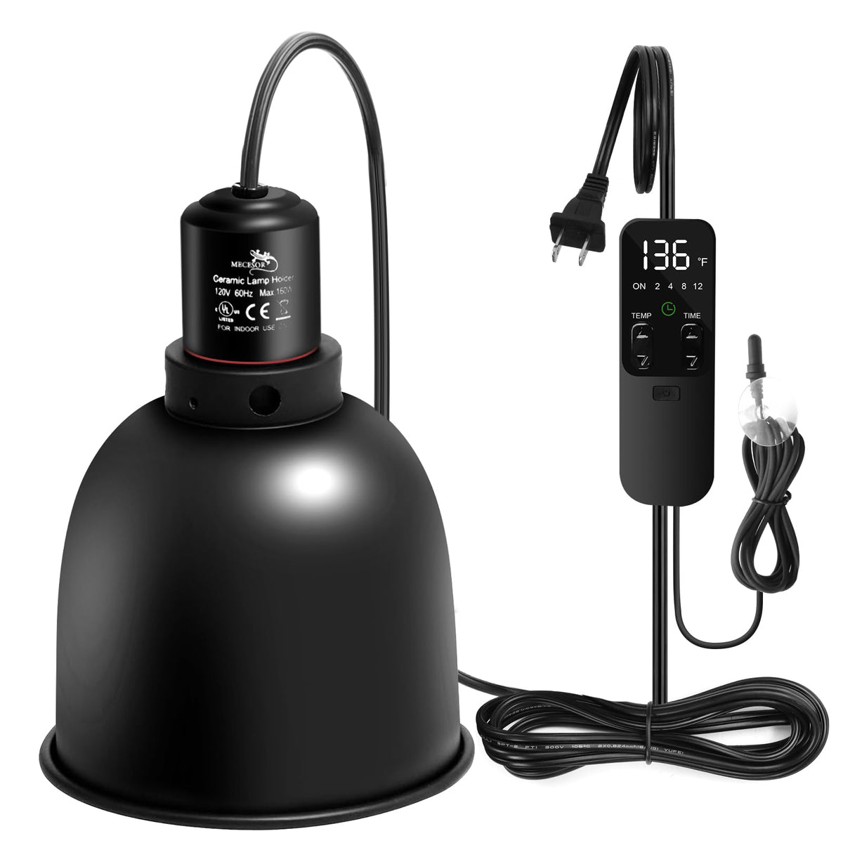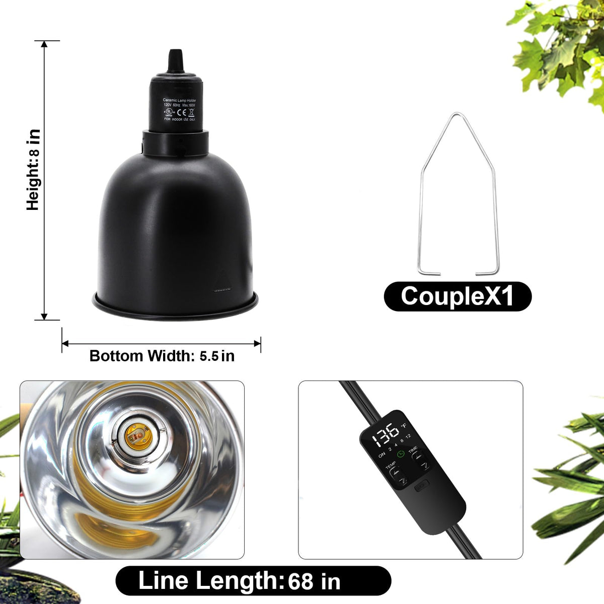 Mecesor Reptile Light Fixture With Thermostatic Timer, 5.5 Inch Deep Dome Lamp Cap Reptile Heat Lamp Fixture With Separate Switches, Terrariums Light Fixture For Uvb Bulb Reptile Basking Heat Bulb The Basking Light Fixtures For Bearded Dragon Has A Led Digital Screen Can Directly Display The Setting Value. You Can Set A Suitable Temperature And Timing According To Your Reptile'S Needs. Besides The Mode ''Always On'', You Can Set The Timer For 2?4?8?12 Hours According To Your Needs. Our Reptile Heat Lamp Fixture Will Give Your Pet With A Nice Living Environment. Our Reptile Heat Lamp Fixture With Separate Switch Is Perfect For Reptiles, Amphibians, And Small Animals Such As Bearded Dragons, Geckos, Turtles, Tortoises, Lizards, Snakes, Chameleons, Frogs, Etc. Specification: Item Name: Reptile Light Fixture With Thermostatic Timer Color: Black Package Included: 1 X 5.5Inch Reptile Heat Lamp Fixture With Thermostatic Timing