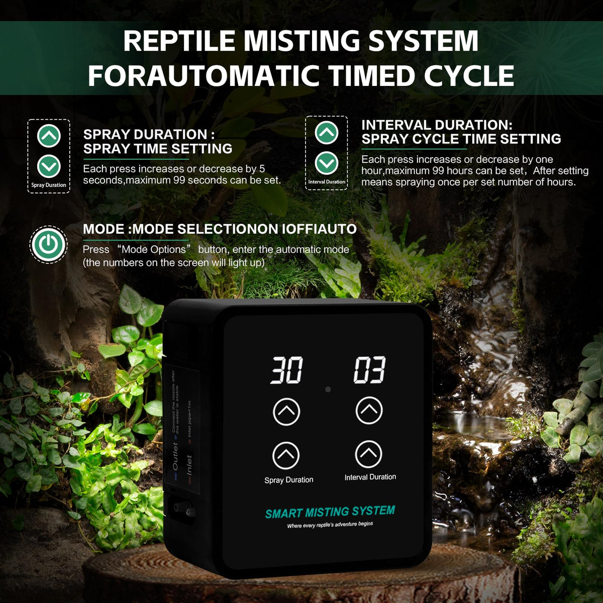 MECESOR Reptile Mister Humidifiers Smart Misting System for Reptile Terrariums Reptile Mister Automatic with Timer for Chameleons Snake Frog Turtle LizardHydration is necessary for reptile habitats. This is essential in helping them lay eggs, hatch them and stay healthy. Reptile humidifiers automate the process of adding moisture to terrariums. This way your pet can enjoy an environment consistent with the rainforest.Specification:Item name: reptile mister system for Reptile TerrariumsPackage included: 1 x Reptile Mister Humidifiers/automatic reptile mister