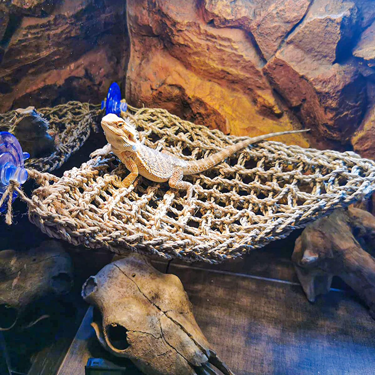 ?High Quality Safety Material?Bearded dragon tank accessories are made with non-toxic polyethylene plastic and soft silk leaves clear texture and bright color safe and durable create a fun & dynamic hiding spot and climbing for reptile amphibians. The hammock is made of 100% natural seagrass.