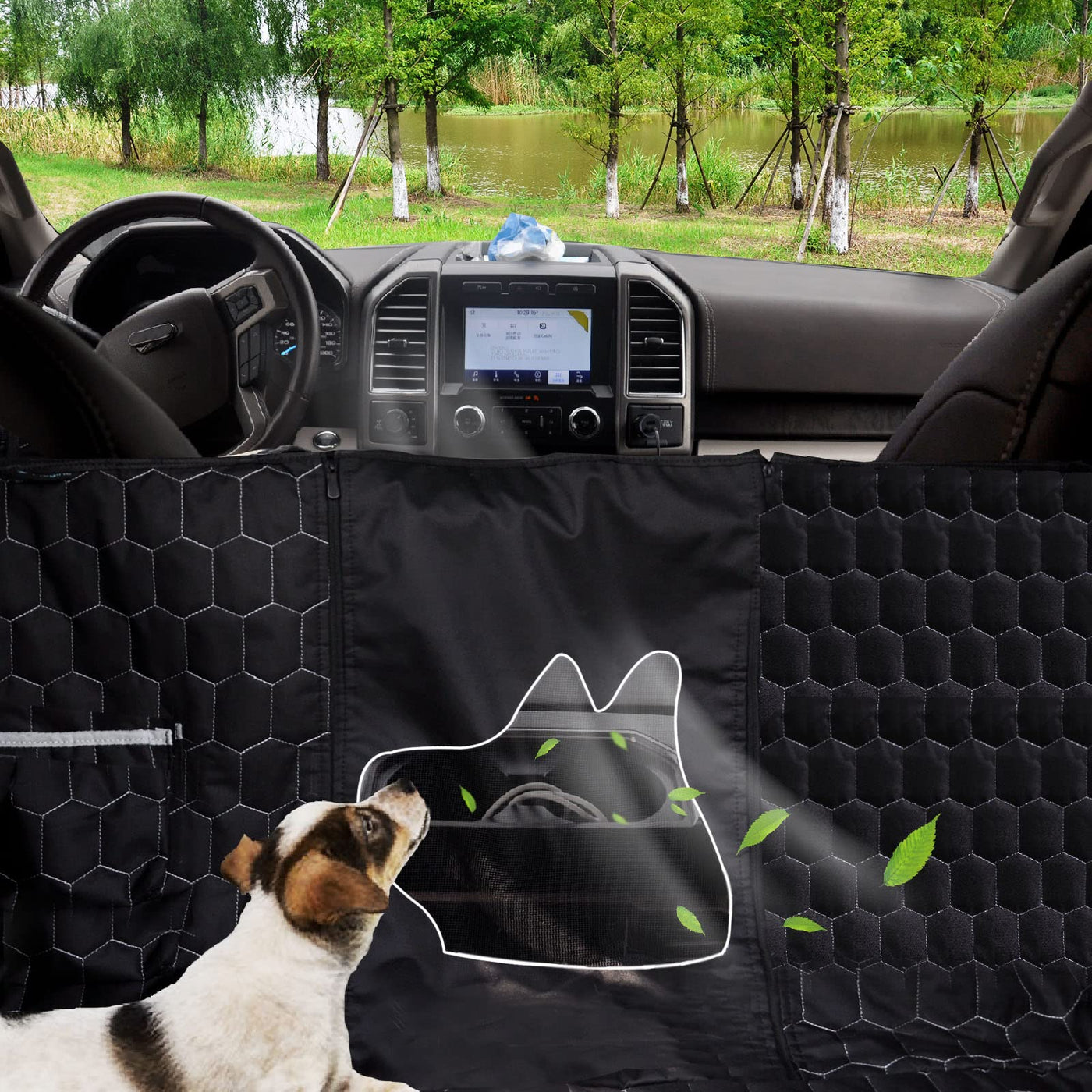 Special Design for F150 & RAM 1500This dog seat cover specially designed for F150F250F450ram 15002500 Size perfectly fit for f150 rear seat cover luxuriously decorated Embedded in the window with side flaps more suitable for f150 ram 1500 than hammock side flaps esh Window & Storage BagThe scratch-resistant PVc mesh is dog-head design which provides better air circulation for your dog It also helps reduce anxiety if the dog cant see you at the same time you can drive at ease Odor-Freeog seat cover made of eco-friendly materials Full protection for car rear seat The elasticity of the buckle is adjustable No smell in high temperature environment Take your dog to see the world Super Waterproof and Non-slip600D Oxford cloth material four layers of protectionThe bottom is made of glue dropping design which is more non-slip will not fade TPU super waterproof design you can easily take your pet out for travel without worrying about the bad experience caused by mud scratches and hair Easy to Install and cleanog truck seat cover can be wiped simply with a wet towel and a pet hair remover Stains are no longer a problem that bothers you The mesh window with zipper design allows people and pets to sit in the back seat at the same time Each function is made for more easy and pratical use