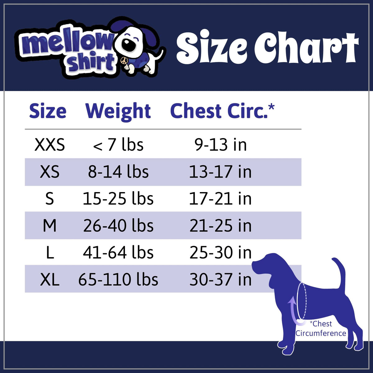 Q: What size Mellow Shirt should I get for my dog?A: The X-Small Mellow Shirt is designed for dogs weighing between 8 to 14 pounds, with a chest circumference of 13 to 17 inches. It's important to measure your dog before ordering to ensure a proper fit.