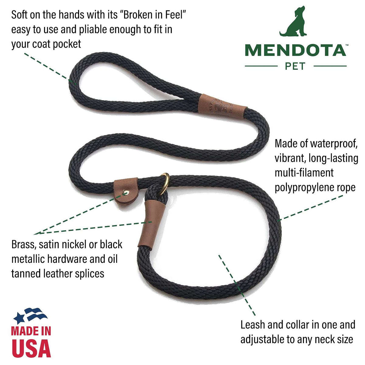 Discover the timeless design and lasting quality of the Mendota Products Small Slip Solid Dog Lead. Handcrafted in the USA, this British-style lead is a leash and collar in one convenient design—something that’s been used by professional trainers for years, and is now adapted for walking and training. It’s made from a durable, multi-filament braided rope with a “broken in” feel that is soft on your hands and pliable enough to roll up and put in your pocket. The oil-tanned leather splices and coordinating hardware give the beautiful finishing touch, proving that the best design is found in the simple details.