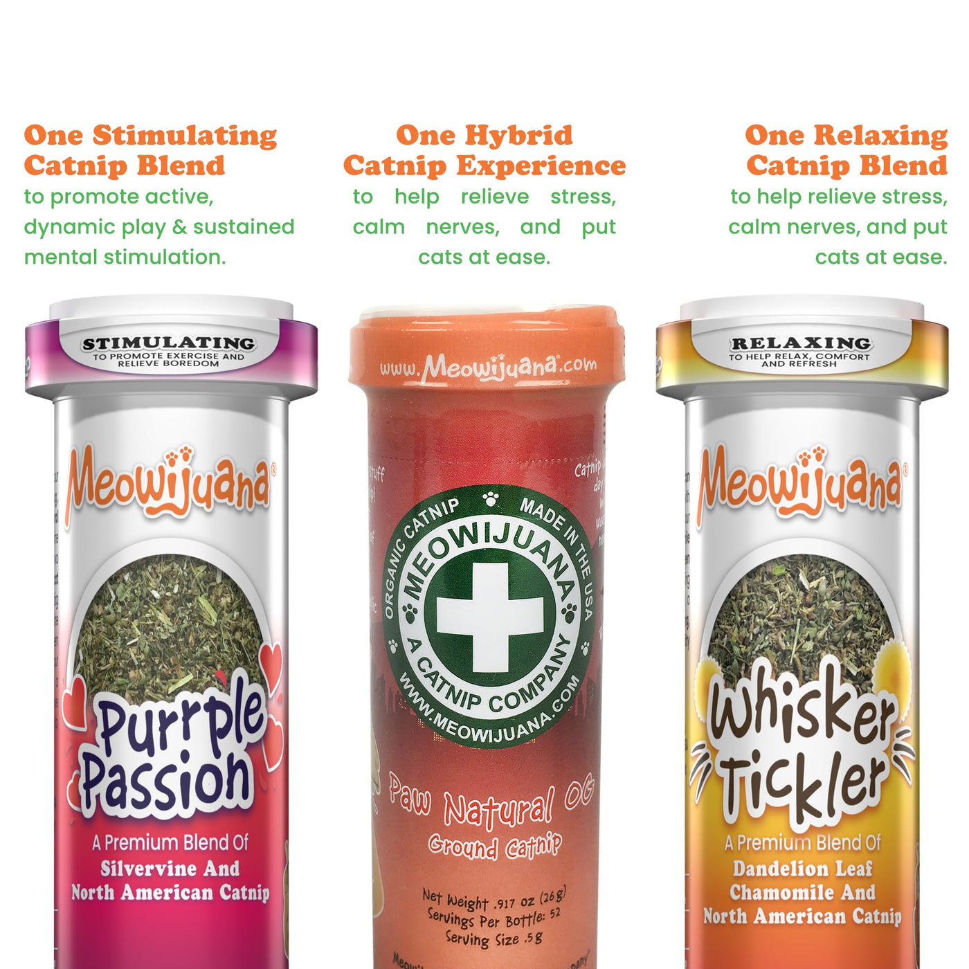 Give your cat the ultimate sensory treat with these high potency catnip bottles - a trio of feline favorite blends. Known to excite even the most mellow felines, this aromatic duo brings out energetic play, zoomies, cheek rubs, and purrs with every sprinkle. Ideal for scratchers, beds, and refillable toys. Crafted from organic North American catnip and blended with trimmings from catnip buds, this premium formula offers natural enrichment. Whether used for solo play or winding down after zoomies, it encourages sensory stimulation and healthy feline behavior with every whiff. Each bottle contains hand-sifted, fine-ground catnip for a feather-soft feel and strong aroma. Designed for easy sprinkling and consistent quality, this texture enhances your cats experience while reducing rough stems. Great for cats looking to chill out in style. This catnip blend is perfect for indoor cats that need help balancing active play with calming downtime. Whether sprinkled on a scratcher or used in a refillable toy, it helps reduce boredom, encourages positive behavior, and offers a fun way to unwind. Meowijuana catnip blends are non-addictive and made for feline use only. Offer every other day to maintain effectiveness. Not all cats respond - especially those under one year. Always supervise during use and enjoy peace of mind knowing its made from only the good stuff.