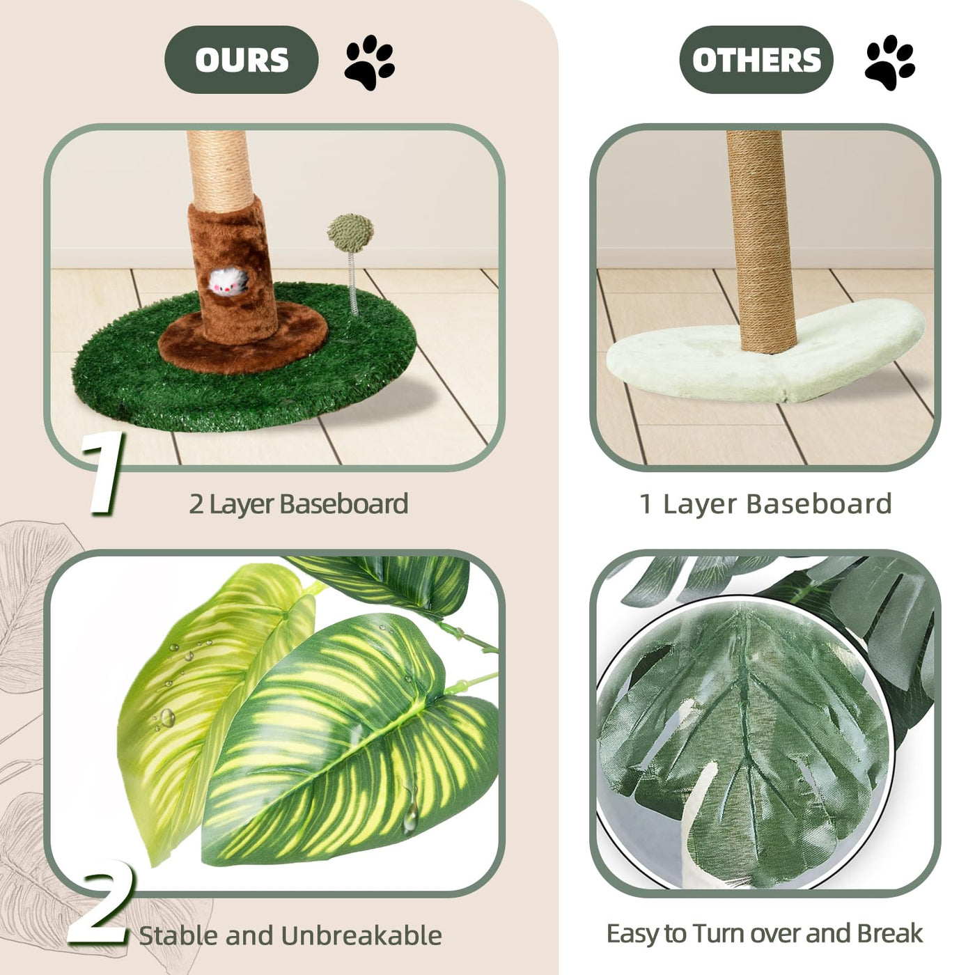Q: What design features make the scratching post appealing for indoor use?A: The scratching post is designed with stylish Monstera leaf elements that enhance the natural indoor atmosphere, providing both an aesthetic appeal and a functional space for your cats to enjoy.