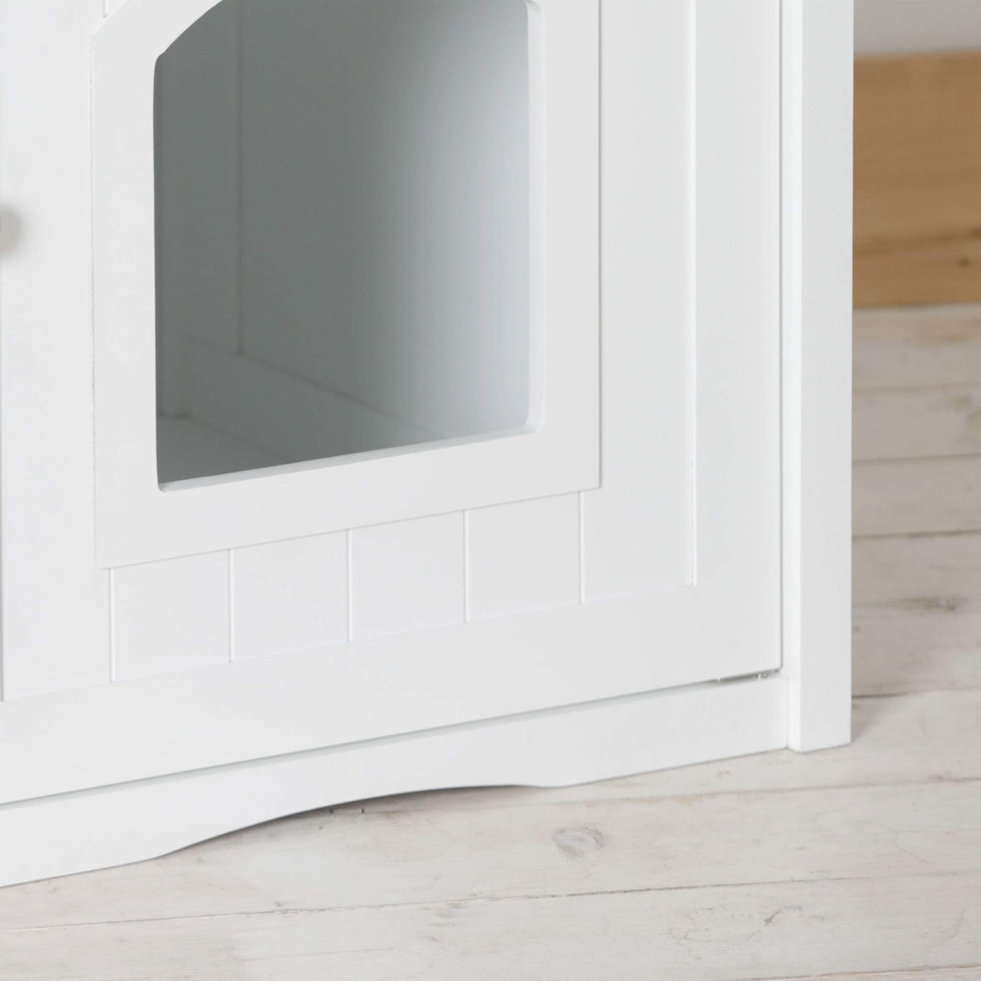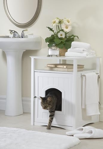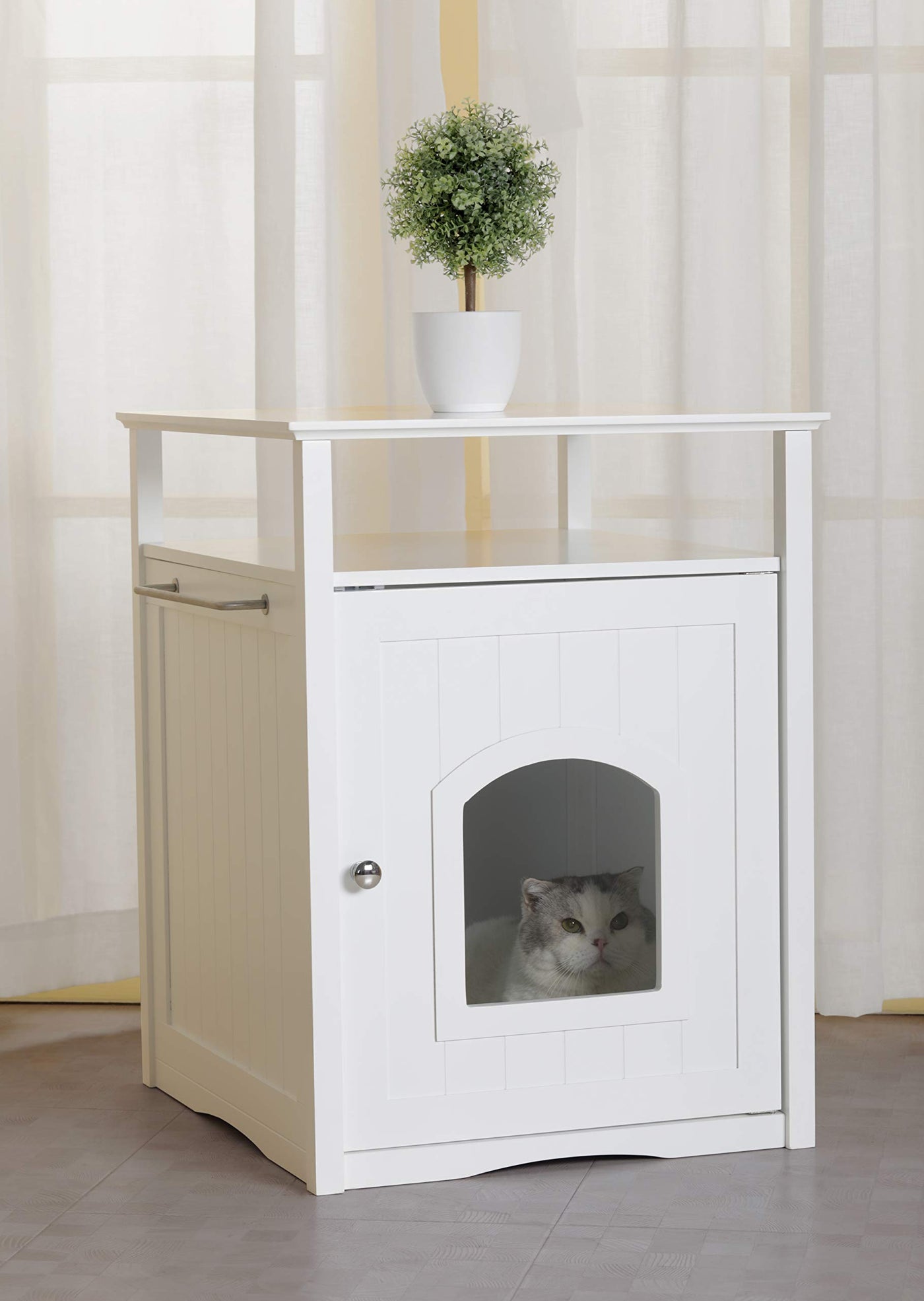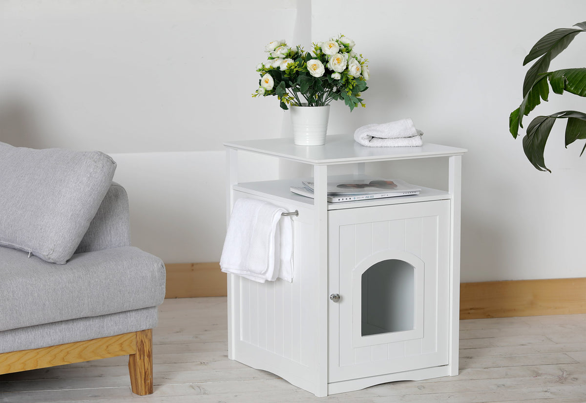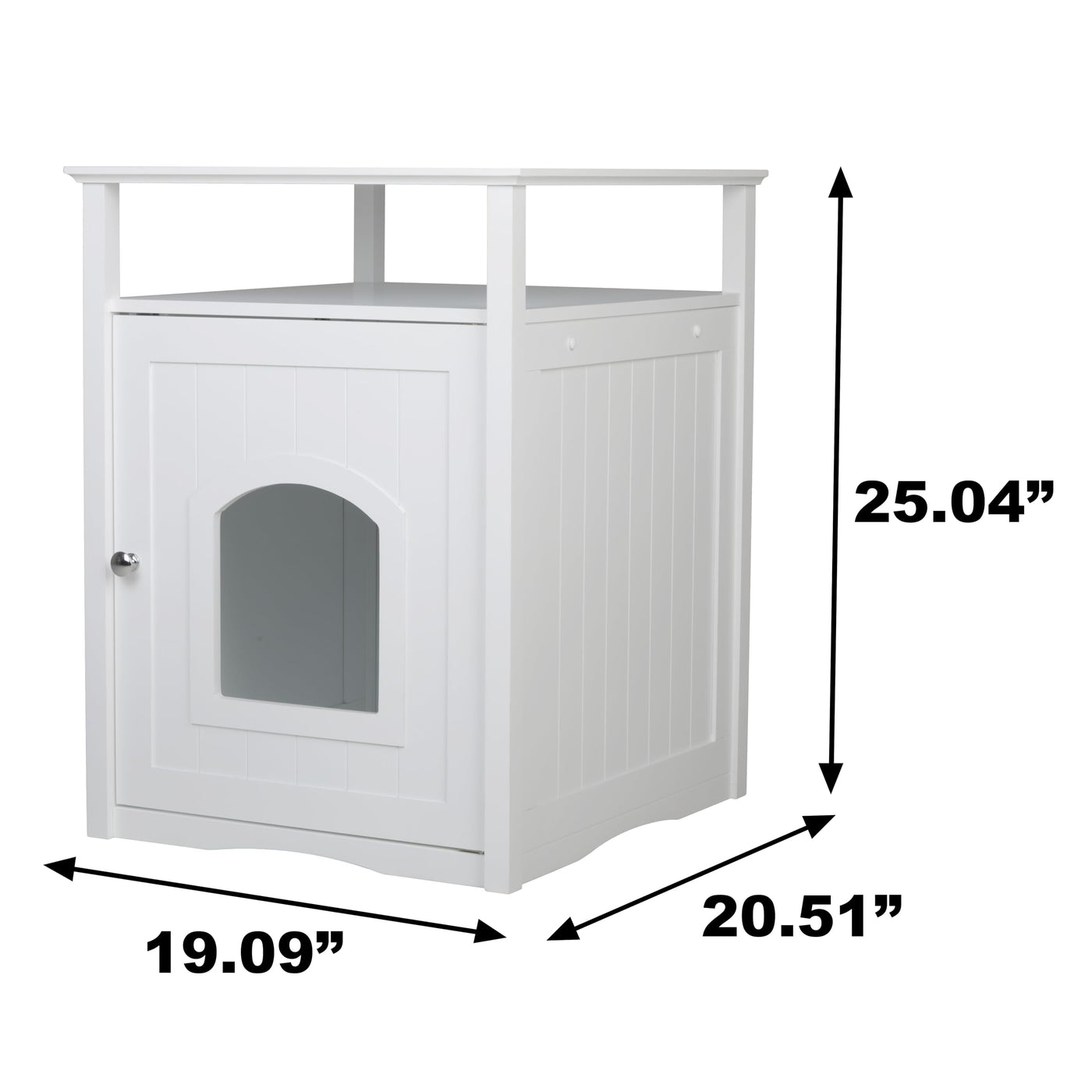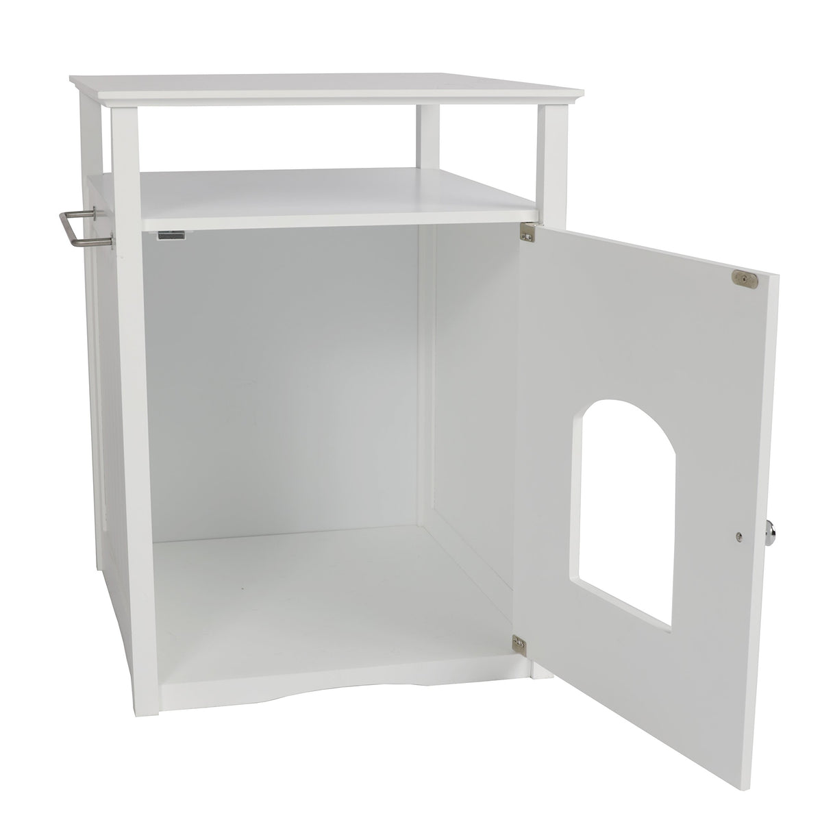 White Cat washroom: No more mess from cat litter boxes. The Cat Washroom serves as an attractive cover to hide away the litter box and confine all litter messes inside, while providing useful shelf space and stainless-steel towel bar for many organizing options. Door opens wide for easy to clean. Fits a large litter pan up to 18.5”W x 16”D. Litter Box not included. Night Stand Pet House: No more unmade and mismatched beds of your pet in your house. This multifunctional unit can also be used as a coffee table or night stand while providing a discrete resting/sleeping area for both dogs and cats, which satisfies your pet’s instinctive need to feel safe and happy., age range: All Life Stages, Included Components: all components of the cat washroom, Material: MDF; stainless steel.