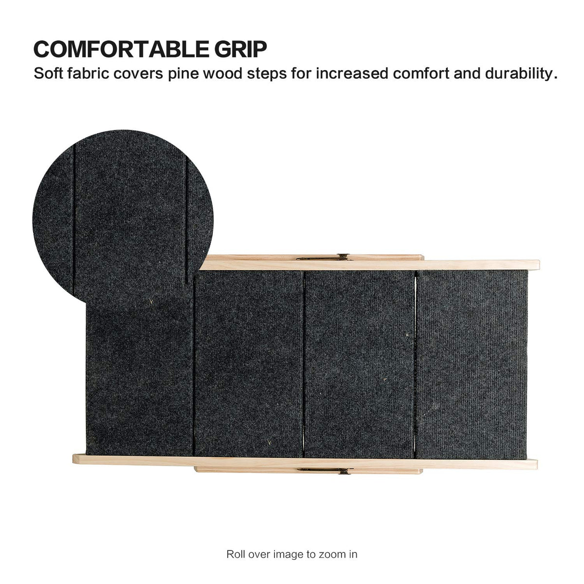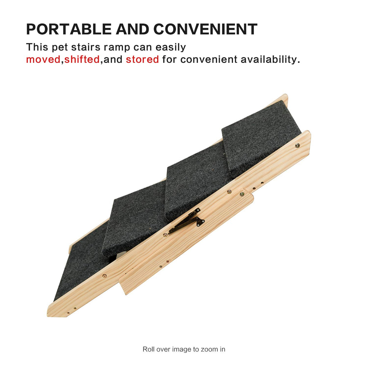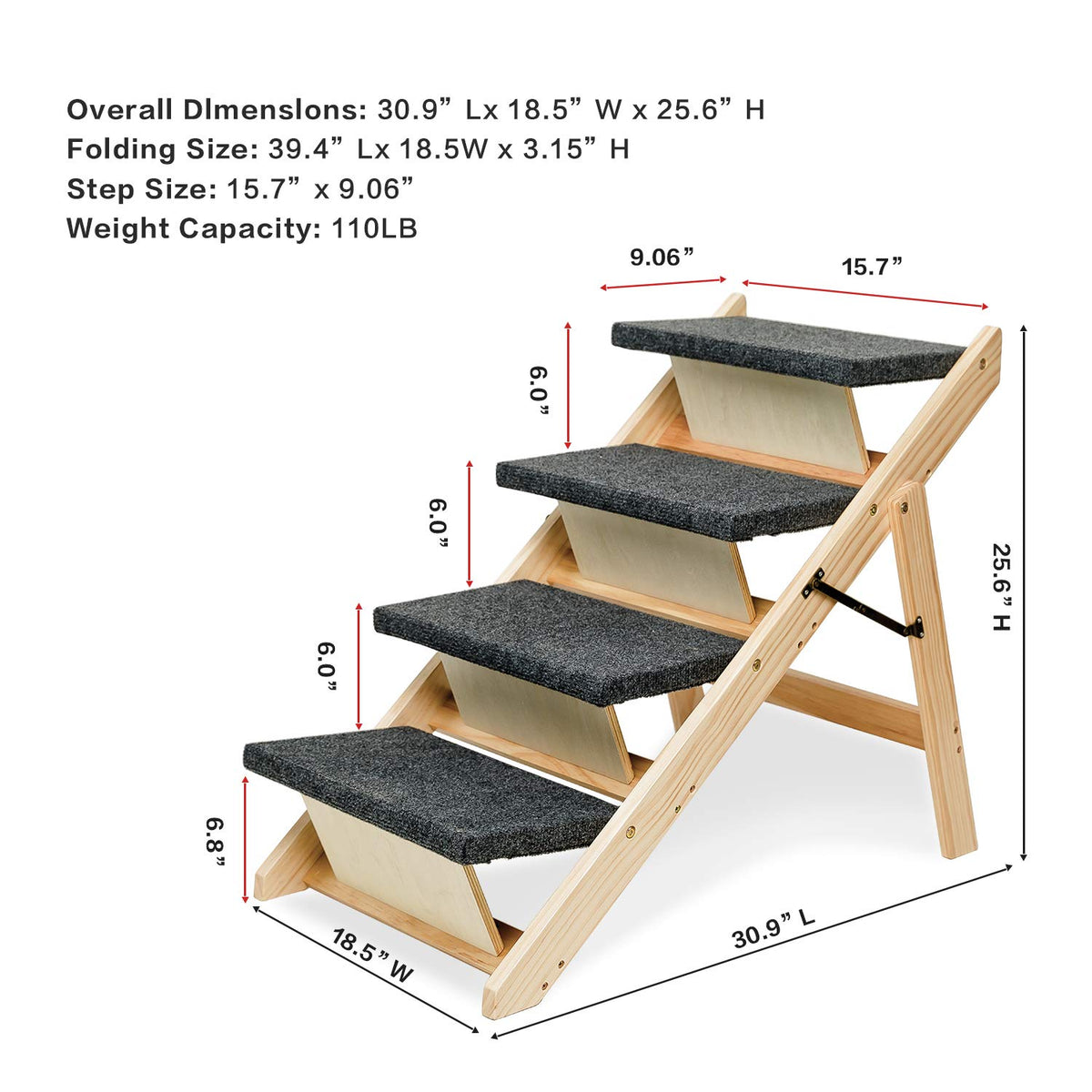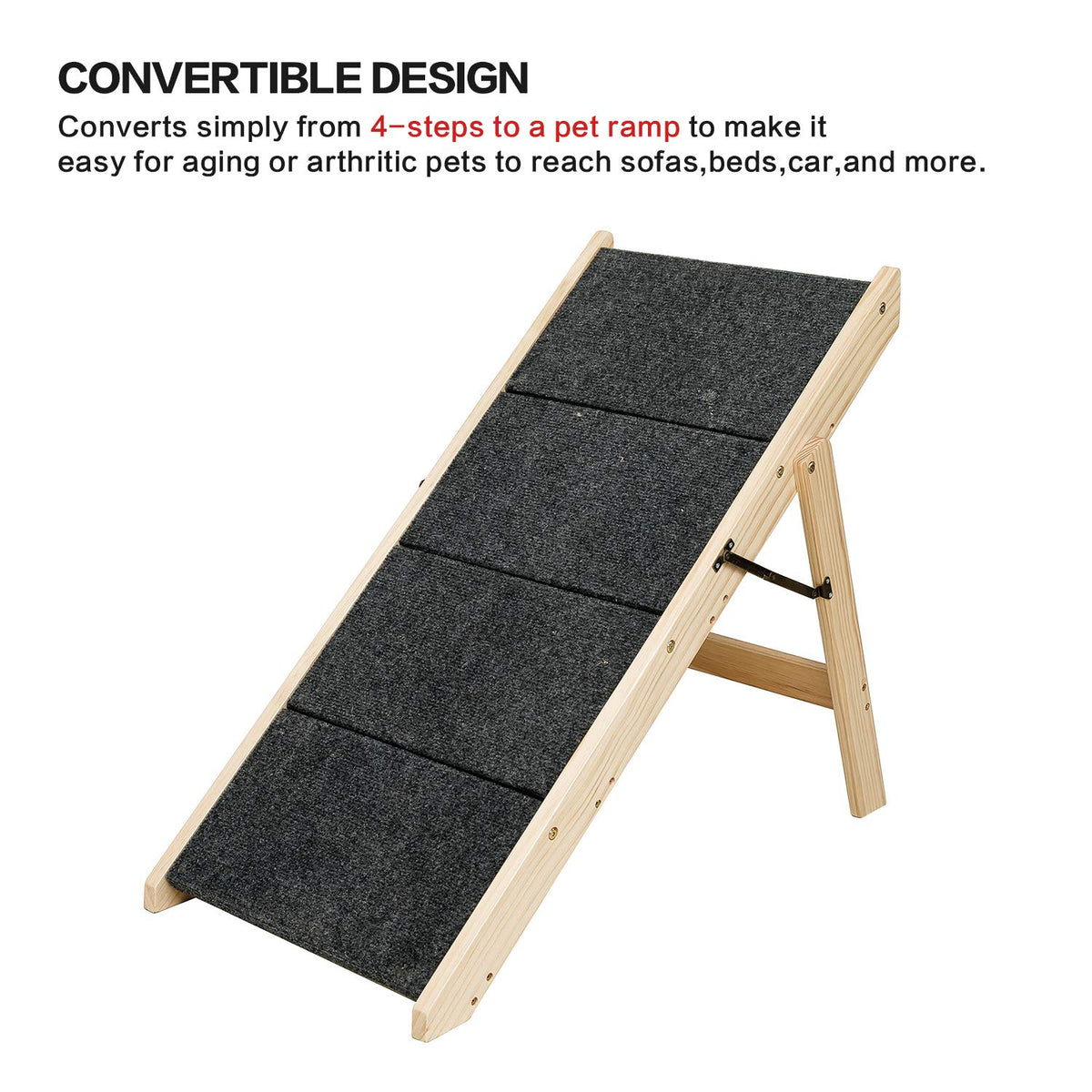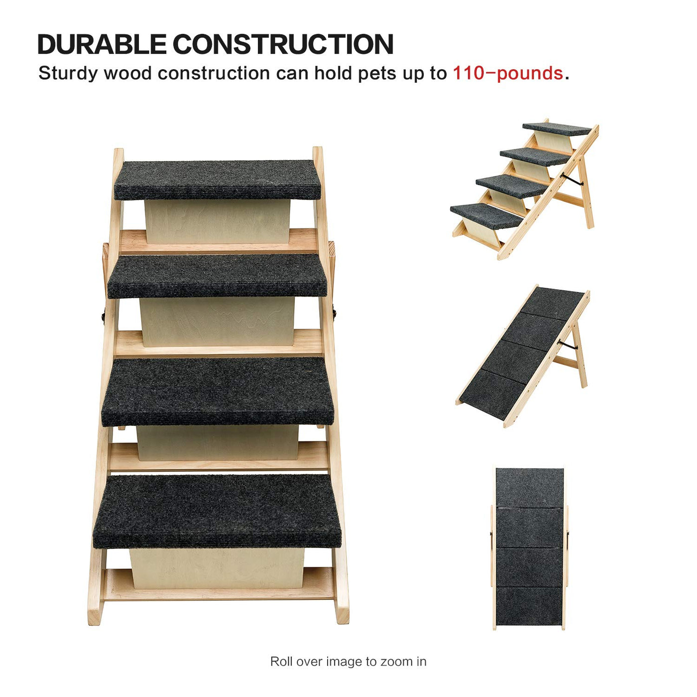 2-IN-1 cONVERTIBLE DESIgN: converts simply from 4-steps to a ramp to make it easy for older or arthritic pets to reach sofas beds cars and more Suitable for old weak and sick pets STURDY AND SAFE: Sturdy wood construction for strong support can hold pets up to 110 pounds cOMFORTABLE AccESS: Nonskid feet Fabric covered ramp and stairs provide traction for your pets paws EASY STORAgE AND PORTABLE: Lightweight and sturdy this pet stairs can be easily moved shifted and stored for convenient accessibility DIMENSION: 309 L x 185 W x 256 H Step Size: 157 x 906 Pet stairs modeAis perfect for Small to Large-sized pets easy to Areach sofas or bedsAPet ramp mode is very steep so it is only suitable for cats and medium to Large-sized dogs not for small dogs
