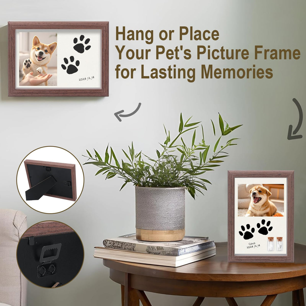 Our 7-Inch Diy Pet Memorial Dog Picture Frame, Thoughtfully Designed To Honor Your Beloved Pet. This Paw Print Kit Includes All The Accessories You Need To Create A Personalized Keepsake: A Diy Pen, Paper, Heat Transfer Paper, And Inkless Pad And 2 Pet Hair Collection Bottles. The Specifications Of Pet Paw Print Impression Kit : Material: Wood Size : 7 Inch Applicable People: Dog Lovers,Cat Lovers And Any Other Pet Lovers Product Use: Collect Pet Hair, Nails, Teeth, Pet Photo Display, Can Be Written On The Paper To The Pet'S Thoughts Of The Statement Applicable Scenes: Wall Hanging / Desktop Table / Entrance Display Application Scenarios: Dog Footprints, Cat And Cat Footprints, Many Other Pets
