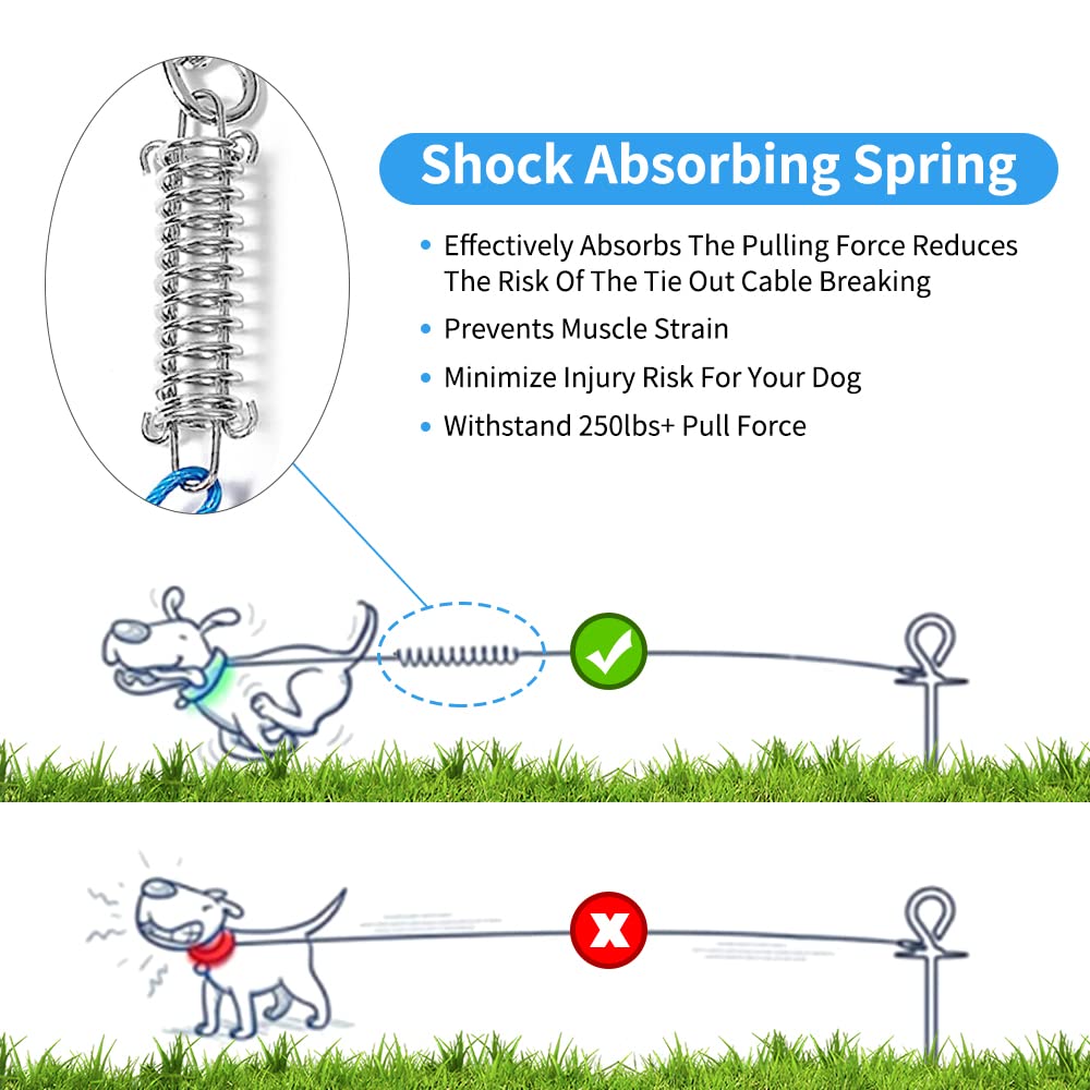 Ultra Strong Dog Tie Out:Tie Out Cable For Dogs Is A Heavy Duty Dog Chain, Durable Dog Tie Out Cable And Extension Spring Providing More Space To Run Or Training. The Dog Tether With 360-Degree Smooth Rotation Buckle, Which Can Reduce The Tangle Of The Cable When The Dog Is Moving.You Can Use It While Camping, At The Park, Yard Or The Beach. Suit For Small, Medium And Large Dogs.