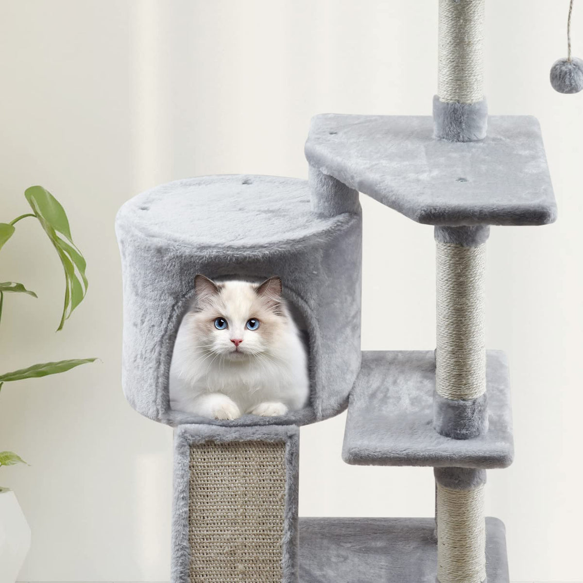 ???Package Included: 1 x Cat Tree House 1 x Instruction Manual 1 x installation Tool ???Product Information: Color:Grey Brand:MIAO PAW Material:Plush Material+CARB Board+Hemp Rope ???NOTES: Please place it in your room corner or against to the wall Children are not allowed to climb or play with this product
