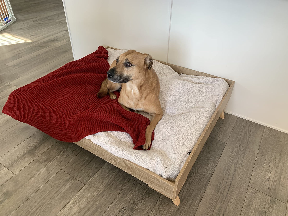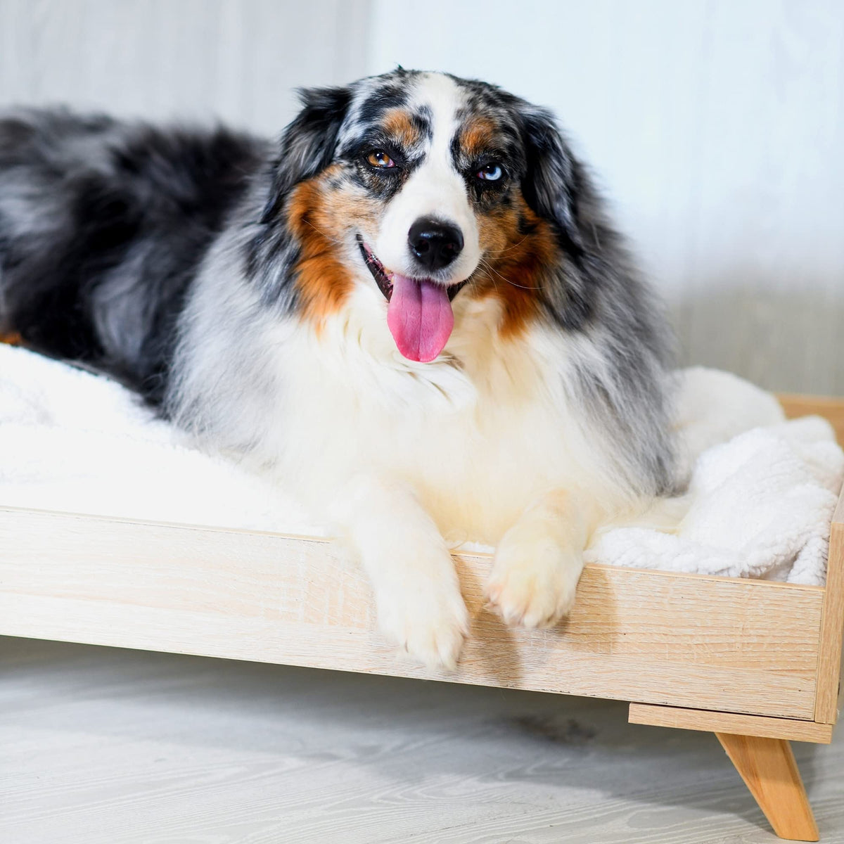 Q: What material is the dog bed frame made from?A: The dog bed frame is made from poplar wood, featuring a smooth, light wood shade that complements various home decors.