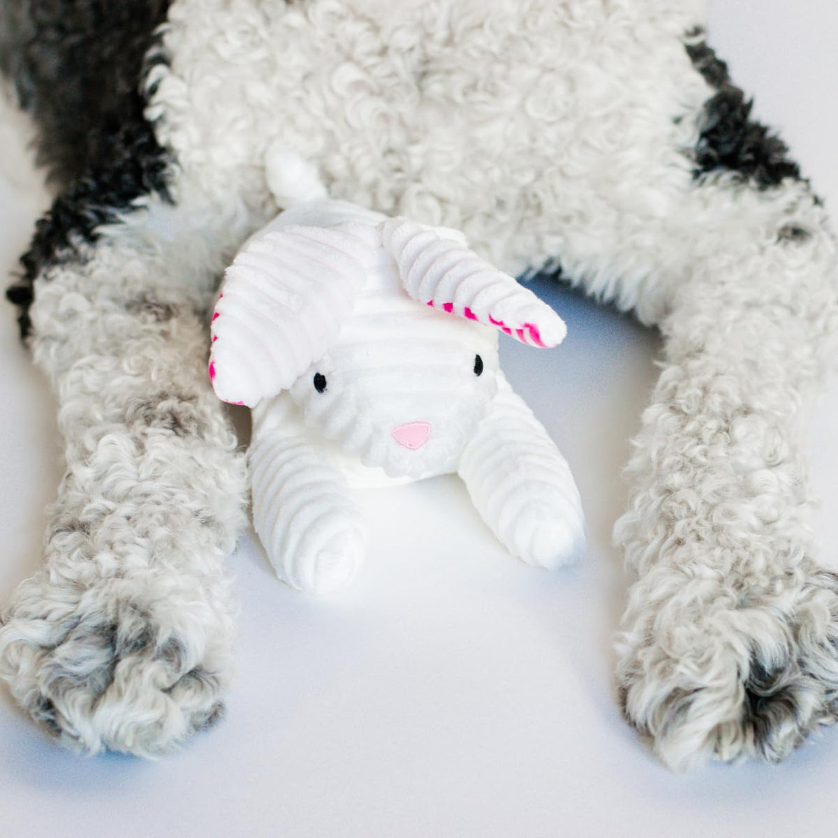 Q: Does this dog toy make any noise?A: Yes, this plush bunny dog toy includes a hidden squeaker that adds an element of fun and excitement during playtime, making it more engaging for your pet.
