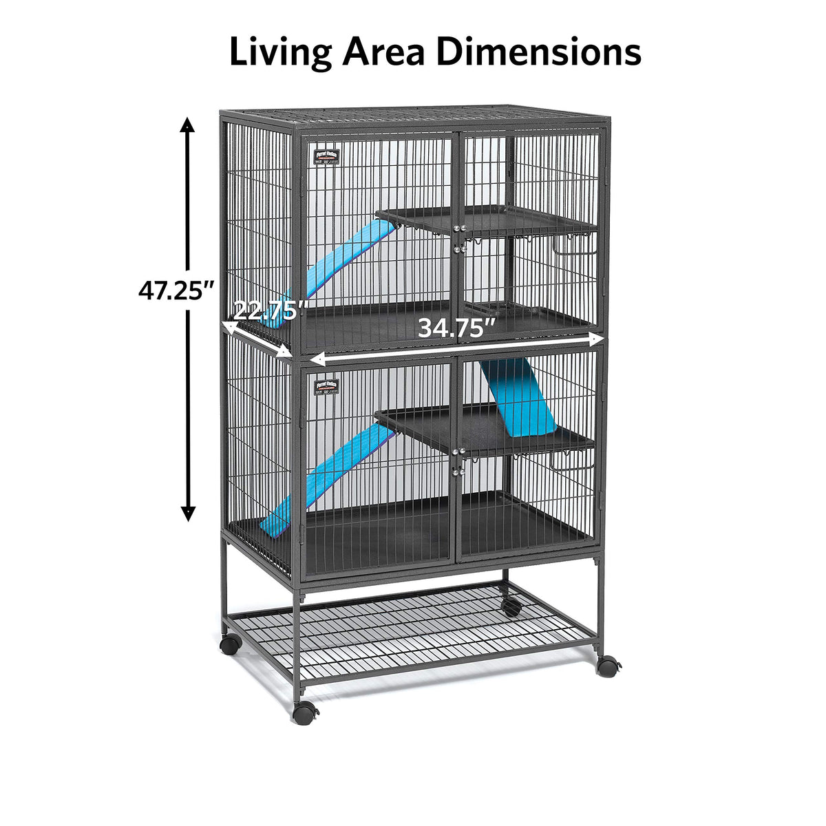 The Ferret Nation Double Unit (model 182) by MidWest Homes for Pets provides the ultimate habitat for your Ferret and works great for a variety of other small animals as well. The double unit Ferret Nation creates the spacious living area Ferrets require to thrive. Each double unit Ferret Nation comes equipped with two ramps and ramp covers, two resting shelves and two easy to remove base pans for easy cleaning. We included full width double doors that provide maximum accessibility for easy cleaning and feeding. The wide expansive shelf and full width plastic pan floor provide a generous play area for your Ferret / Chinchilla / Rat and helps to prevent dangerous falls. Designed with customer convenience in mind, we've included 'critter proof' dual locking door latches that provide a secure, easy one handed operation. Shelves include removable plastic trays for easy cleaning and are height adjustable so you can tailor the Ferret / Small Animal cage to your pet's needs. The Ferret Nation has multiple attaching points for adding hammocks, tubes, toys and other accessories that are sold separately. Includes appropriately angled ramp that is specifically designed to ensure pet safety. Constructed from sturdy square tube frame and strong wire, metal the Ferret Nation has an attractive gray quartz hammer tone finish that is sure to blend with any decor. If you wish to add onto your Ferret Nation cage, please take a look at the Ferret Nation Add On Unit (model 183) and be sure to check out our available Ferret Nation / small animal accessories to spruce up your Ferret Nation as well MidWest Homes for Pets stands behind the quality of our products with a 1 Year Manufacturer.