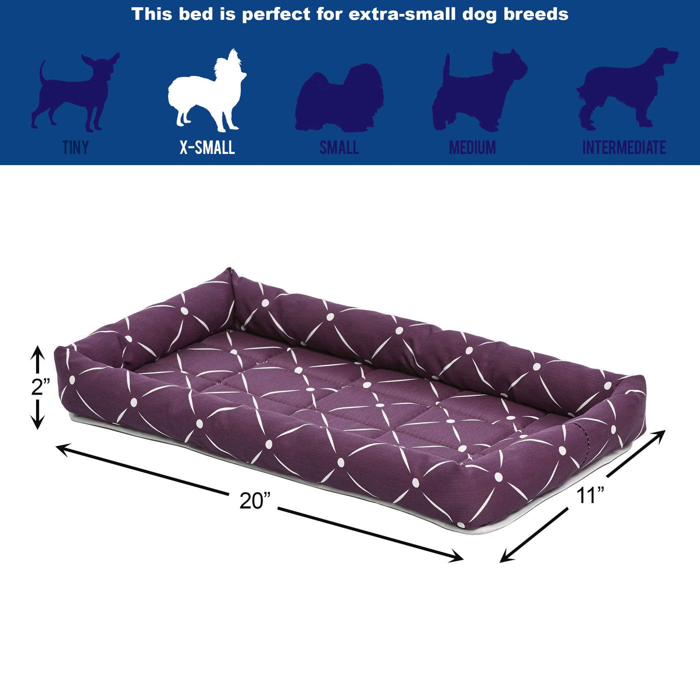 Stylish bolster dog bed designed to fit most 22' long standard dog crates, plum / white pattern pet bed measures 20L x 11W x 2H inches & ideal for x-small dogs | Pet bed's bolster provides support for your dog's head while laying down. Dog bed's trendy pattern adds style & comfort to your dog's crate enticing them to use their home more often | Use dog bed w/ a 22-inch long Midwest metal dog crate to create a cozy den atmosphere for your pet | Each pet bed is machine washable & dryer friendly so it will look cleaner longer | Ashton dog bed comes w/ a 1-year Manufacturer's Warranty & is specifically designed to fit Midwest 22L' dog crates but will fit most 22' folding metal dog crates & plastic dog carriers as well | Age Range Description: All Stages