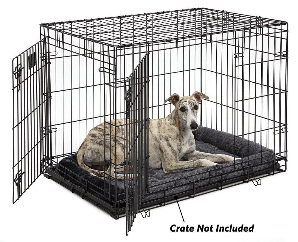 MidWest Homes for Pets is proud to offer the Quiet Time Bolster Fleece Pet Beds to provide your dog or cat with a soft, cozy & welcoming place to rest & relax. These comfortably padded pet beds are ideal for most standard folding metal dog crates, dog carriers, cat carriers, dog houses and work great as a stand alone dog bed / cat bed anywhere in the house or when traveling with your pet. Each gray pet bed is made of polyester with overstuffed bolsters around the perimeter creating a nice headrest adding to your dog or cats overall comfort. This fleece pet bed features a rectangular shape and is sized to fit most standard 36' long dog crates & is ideal for medium / large dogs weighing 41 70 pounds. Since these pet beds are machine washable they are easy to care for and built to last (for best results let dog bed air dry flat on the floor). The gray color helps conceal shedding & compliments any home décor. Please note that the Quiet Time pet bed is not ideal for excessive “chewers” or dogs with high separation anxiety. If your dog is an excessive chewer, we suggest keeping a chew toy with your pet when in the crate in hopes your dog will chew the toy and not the pet bed. MidWest Homes for Pets stands behind the quality of our products with a 1 Year Manufacturer's Warranty. If you have any questions regarding our dog beds or cat beds our customer service department would be glad to help you. MidWest customer service can be contacted, available 9:00 AM 4:00 PM, Monday Friday EST.
