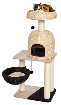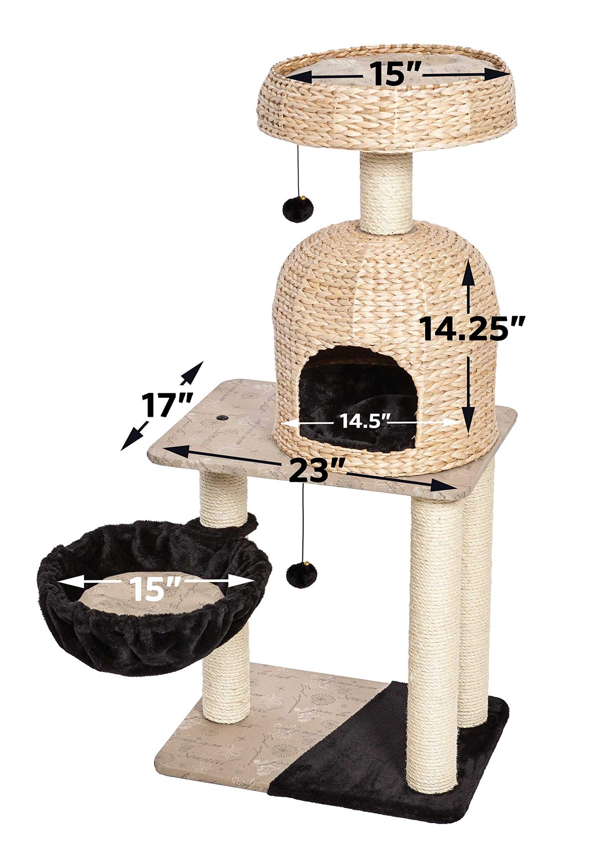 Midwest Feline Nuvo(R) Fine (& Fun) Feline Furniture(R) The Reid Feline Nuvo's Reid has a cozy hoop hammock, a large resting bench, an elevated dome cubby with faux fur pillow, a high-rise basket bed, and sisal-wrapped supports. Features: Beautiful, all-natural woven rattan Ultra-soft, black, faux fur with tan designer print fabric Ball and bell tempt playful recreation Sisal-covered supports offer place for cat to scratch Sturdy multi-tier design provides perfect retreat for lounging and playing Item Specifications: Overall Dimensions: 17.5'L x 38'W x 51.75'H Actual Weight: 32lbs Material/Finish: Carpet, Sisal, Board