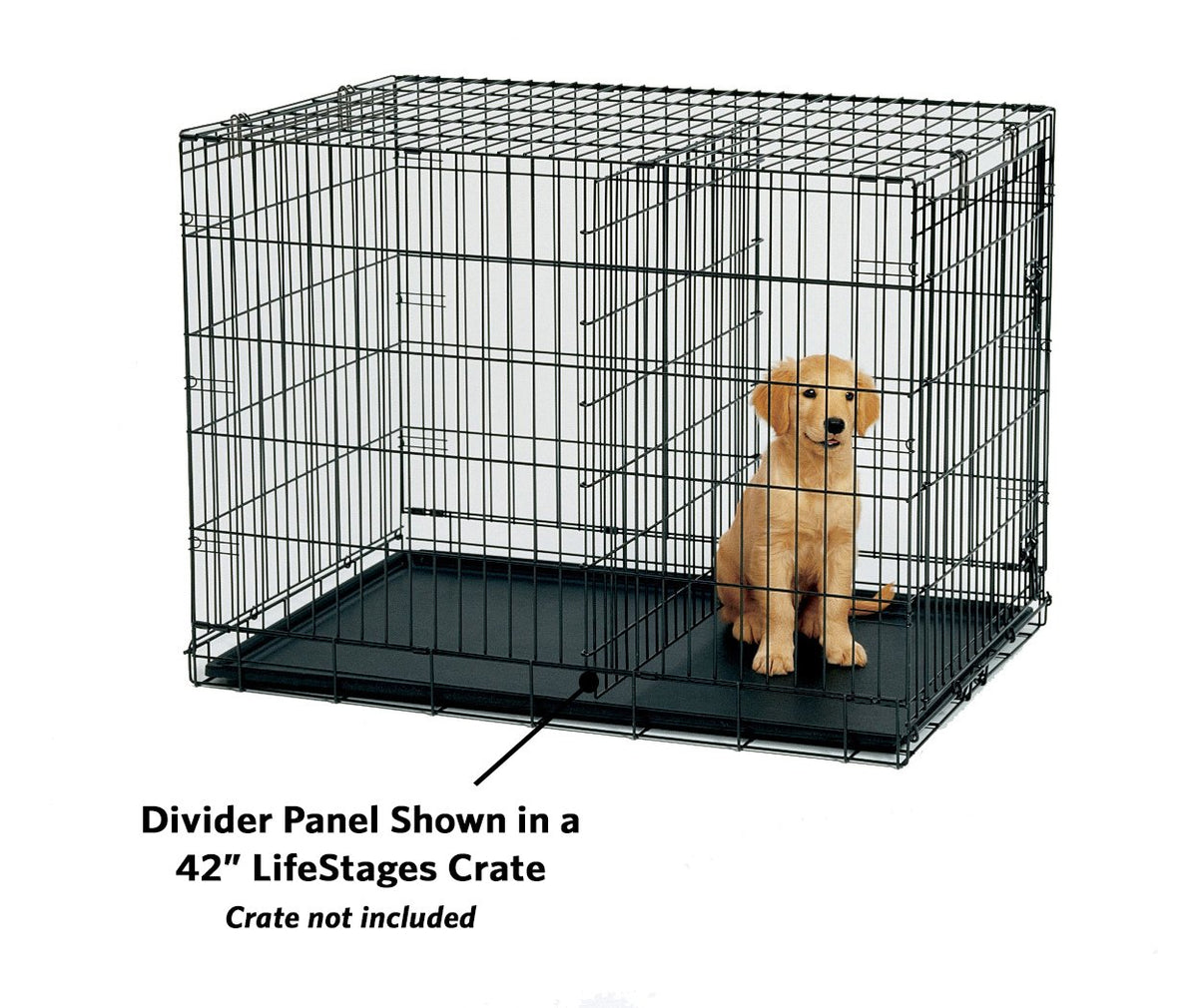 Q: What sizes of dog crates does the MidWest Homes for Pets Dog Crate Divider Panel fit?A: The MidWest Homes for Pets Dog Crate Divider Panel is designed to fit 42-inch large folding dog crates, specifically models including iCrate 1542U, 1542DDU, 1542, 1542DD, Life Stages 1642U, 1642DDU, 1642, 1642DD, Ultima Pro 742UP, and Ovation 1942, 1942DD.