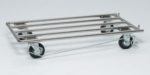 Model 45 tubular crate dolly measures 42 long by 24 wide. Made of strong 16 gauge 1 steel tubing. Durable with attractive nickel chrome plating. Rugged 5 bearing wheels. Heavy nylon pull handle with comfortable rubber hose grip. Note: Two wheels are stationery and two swivel. Neither the wheels or the cart itself have any kind of stops or locks on them.