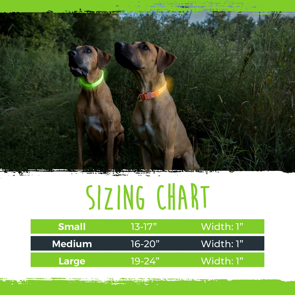 Mighty Paw: By Dog Lovers. For Dog Lovers.Headquartered In Rochester, Ny - We'Re Right Here In The Usa Where We Design And Test All Our Gear. Our Mission Is To Build High-Quality Dog Products That Enable Endless Adventures For You And Your Four-Legged Family. Whether Its Related To Nature, Training, Or Travel - We Will Help Build A Deeper Connection Between You And Your Dog!Mighty Paw Safety Led Dog Collarmighty Paws Safety Led Dog Collar Is Available In Orange And Green And Provides Ultimate Visibility In Low Or No Light Conditions. Its Available In 3 Sizes For Your Small, Medium And Large Pups And Features Two Light Strips For Maximum Brightness.You Can Easily Alternate Between 3 Highly Visible Light Modes: Quick Flash, Slow Flash And Continuous Light Mode.Of Course We Designed Our Led Collar With Premium Nylon And Durable Hardware For Long Lasting Use! Additionally, Its Weather Resistant And Features A Rubber Charging Seal That Protects From Rain. That Means You Can Use It For Walks And Playtime In All Weather Conditions And Climates.Last But Not Least, You Can Easily Charge Our Led Collar Using A Mini Usb Cable, Which Is Included. The Battery Lasts 6 Hours On A Full Charge And Takes About 2 Hours To Charge.3 Highly Visible Light Modes2 Light Stripsmaximum Brightness In Low Light Conditionskeeps You And Your Dog Safe At Nightpremium Nylondurable Hardwarelong Lastingrubber Charging Sealweather Resistant Designgreat For All Climatesrechargeablebattery Lasts 6 Hoursincludes Mini-Usb Charging Cable3 Sizes: Small, Medium And Largegood For Small, Medium And Large Dogsavailable In Orange And Greenclick Add To Cart To Keep You And Your Pup Safe At Night Your Pup Will Thank You!&Nbsp;