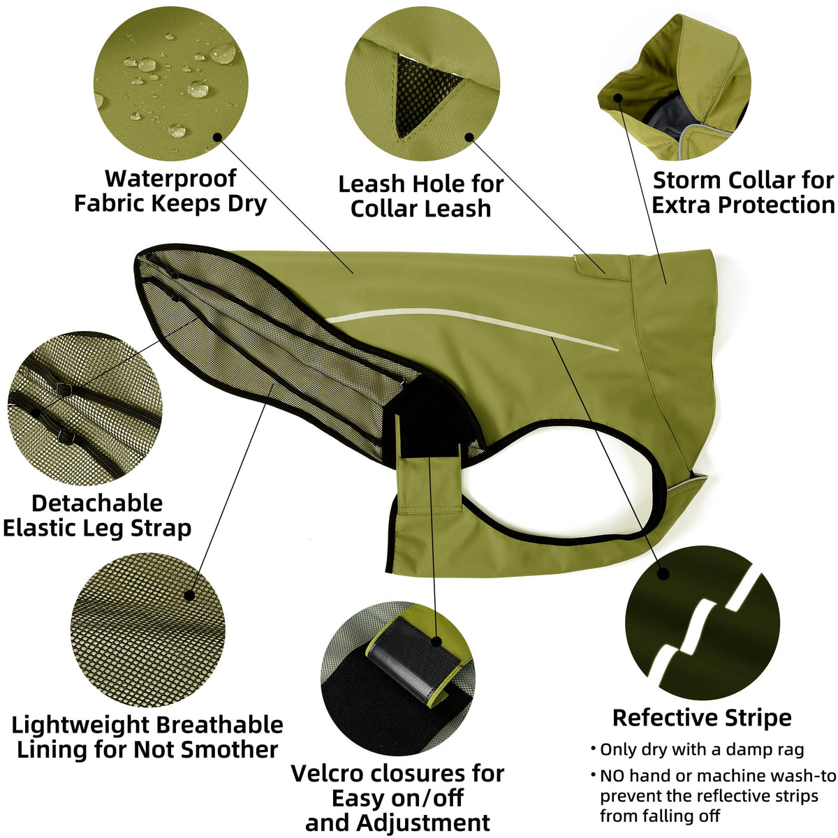 MATERIAL: Premium lite weight outdoor breathable waterproof fabric equivalent to materials for human raincoat with reflective stripe.